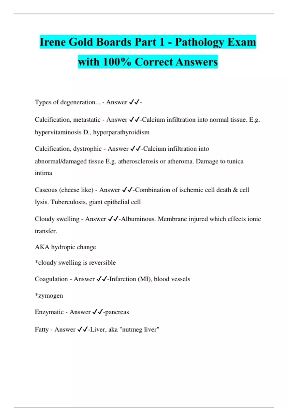 Irene Gold Boards Part 1 - Pathology Exam with 100% Correct Answers Types of degeneration... - Answer ️️ - Calcification, metastatic - Answer ️️ -Calcium infiltration into normal tissue. E.g. hypervitaminosis D., hyperparathyroidism Calcification, dystrophic - Answer ️️ -Calcium infiltration into abnormal/damaged tissue E.g. atherosclerosis or atheroma. Damage to tunica intima Caseous (cheese like) - Answer ️️ -Combination of ischemic cell death & cell lysis. Tuberculosis, giant epithelial cell Cloudy swelling - Answer ️️ -Albuminous. Membrane injured which effects ionic transfer. AKA hydropic change *cloudy swelling is reversible Coagulation - Answer ️️ -Infarction (MI), blood vessels *zymogen Enzymatic - Answer ️️ -pancreas Fatty - Answer ️️ -Liver, aka "nutmeg liver" heart, aka "tabby cat heart" fatty dot > fatty streak > atheroma (fatty plaque) > fibroatheroma (fibrous tissue, calcium) Liquefaction - Answer ️️ -CNS E.g. brain melts, tertiary syphilis, leprosy Skin (if from infection) tabes dorsalis Wallerian - Answer ️️ -Peripheral nerves. Degenerates to the next node of ranvier. "dying back phenomenon" Zenker's (waxy) - Answer ️️ -Hyaline. Most common in skeletal muscle. Muscle replaced with hyaline Degeneration of nucleus... - Answer ️️ -cell must die Karyo = nucleus Karyolysis - Answer ️️ -nuclear fading/rupture (DNA breakdown: irreversible) Karyorrhexis - Answer ️️ -Nuclear swelling (chromattin fragmentation) Pyknosis - Answer ️️ -Nuclear condensation AKA karyopyknosis Developmental changes... - Answer ️️ - Agenesis - Answer ️️ -absence of an organ (usually pair organ) Aplasia - Answer ️️ -Small remnants of the organ present (lack of development) Hypoplasia - Answer ️️ -organ smaller than normal and defective Disturbances of growth... - Answer ️️ - Atrophy - Answer ️️ -Decrease in size (disuse atrophy). seen mostly in muscle Hypertrophy - Answer ️️ -Increase in size (E.g. muscle exercise) Hyperplasia - Answer ️️ -Increase in number of cells (e.g. pregnant uterus, goiter, callous) Metaplasia - Answer ️️ -Changes from one cell type to another. E.g. pseudostratified ciliated columnar epithelium (PCCE) changing into stratified squamous in lungs of smokers. GERD > Barretts Dysplasia - Answer ️️ -Change in size, shape or function of a cell. Precancerous, but last stage that can reverse to normal Anaplasia - Answer ️️ -Complete disorganization of a cell (cancer) E.g. squamous cell carcinoma Collagen types... - Answer ️️ - Type 1 collagen - Answer ️️ -Bone, muscle, tendons & ligaments, annulus fibrosis Type 2 collagen - Answer ️️ -Disc (specifically nucleus pulposis), notochord Type 3 collagen - Answer ️️ -'Reticular collagen'. found in spleen & lymph nodes. Also seen in early wound healing Type 4 collagen - Answer ️️ -Basement membrane Pneumococnosis: - Answer ️️ -Inhalation & deposition of dust particles in the lung START PAGE 3: PNEUMOCONIOSIS: Inhalation & deposition of dust particles in the lung Silicosis - Answer ️️ -Silica from sand, rock, or glass. Sandblasters at risk. "rocky quarry disease" Asbestosis - Answer ️️ -asbestos leads to mesothelioma. malignant tumor Siderosis - Answer ️️ -Iron dust Byssinosis - Answer ️️ -Cotton dust. "brown lung" Anthracosis - Answer ️️ -Black lung disease from miners. "Caplan's syndrome" = anthracosis + RA Histomycosis/Histoplasmosis - Answer ️️ -Endemic fungus around mississippi or ohio valleys. "Ohio valley fever" AKA "mississippi valley fever" *bird/bat droppings Coccidiomycosis - Answer ️️ -Endemic fungus in deserts of southwest. Aka "san joaquin valley fever". Called 'valley fever' in other states Blastomycosis - Answer ️️ -Endemic fungus on eastern seaboard: From flordia to nova scotia Cryptococcus - Answer ️️ -Bird droppings (in soil) Lung diseases - Answer ️️ - Asthma - Answer ️️ -Sputum analysis yields "Curschmann's spirals" or "Charcot leyden crystals" *Type 1 HS
