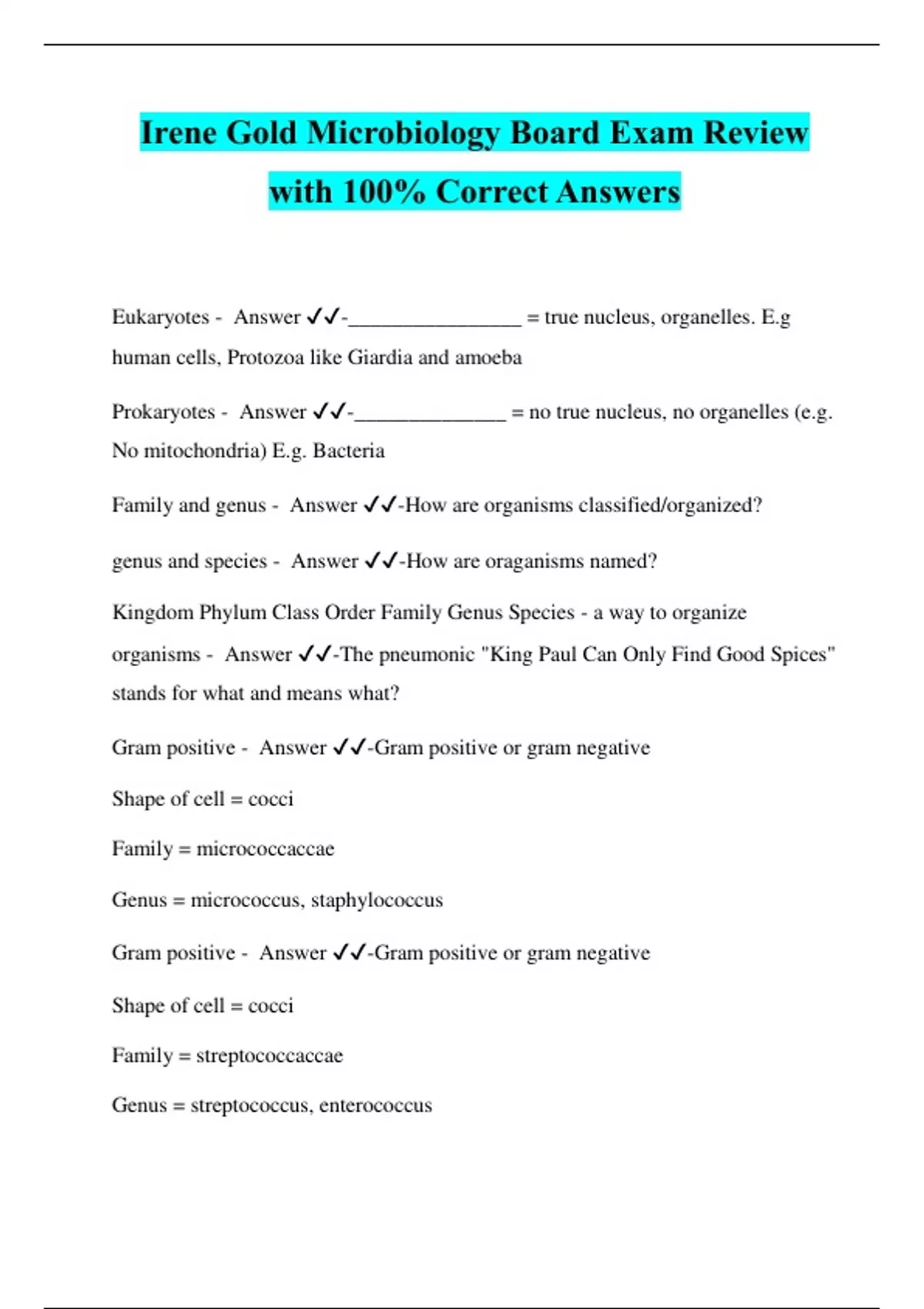 Irene Gold Microbiology Board Exam Review with 100% Correct Answers Eukaryotes - Answer ️️ -________________ = true nucleus, organelles. E.g human cells, Protozoa like Giardia and amoeba Prokaryotes - Answer ️️ -______________ = no true nucleus, no organelles (e.g. No mitochondria) E.g. Bacteria Family and genus - Answer ️️ -How are organisms classified/organized? genus and species - Answer ️️ -How are oraganisms named? Kingdom Phylum Class Order Family Genus Species - a way to organize organisms - Answer ️️ -The pneumonic "King Paul Can Only Find Good Spices" stands for what and means what? Gram positive - Answer ️️ -Gram positive or gram negative Shape of cell = cocci Family = micrococcaccae Genus = micrococcus, staphylococcus Gram positive - Answer ️️ -Gram positive or gram negative Shape of cell = cocci Family = streptococcaccae Genus = streptococcus, enterococcus Gram positive - Answer ️️ -Gram positive or gram negative Shape of cell = bacilli Family = bacillaccae (spore formers) Genus = bacillus, clostridium-ANAEROBIC Gram positive - Answer ️️ -Gram positive or gram negative Shape of cell = bacilli Family = lactobacillacae Genus = lactobacillus Gram negative - Answer ️️ -Gram positive or gram negative Shape of cell = cocci Family = neisseriaccae Genus = neisseria Gram negative - Answer ️️ -Gram positive or Gram negative Shape of cell = bacilli Family = enterobacterioccae, vibrianaccae, spirillaccae, pseudomonadacceae, pasteurellaceae, bacteroidosceae Genus = eneterbacter, escherichia, klebsiella, proteus, salmonella, serratia, shigella, yersina, vibrio, campylobocter, pseudomonas, bacteroides=anaerobic Adenoviridae - Answer ️️ -What is the virus family of the DNA human virus Adenovirus Papillomaviridae - Answer ️️ -What is the virus family of the DNA human virus papillomavirus Herpesviridae - Answer ️️ -What is the virus family of the DNA human virus' herpes simplex virus, varicella-zoster virus, cytomegalovirus, and Epstein Barr Virus? Poxviridae - Answer ️️ -What is the virus family of the DNA human virus' smallpox, vaccinia virus, molluscum contagiosum virus? Hepadnaviridae - Answer ️️ -What is the virus family for the DNA human virus hepatitis B? Paramyxoviridae - Answer ️️ -What is the virus family for the RNA human viruses measles, mumps, respiratory syncytial virus? Orthomyxoviridae - Answer ️️ -What is the virus family for the RNA human viruses influenza virus A, B, and C? Rhabdoviridae - Answer ️️ -What is the virus family of the RNA human virus rabies? Filoviridae - Answer ️️ -What is the virus family of the RNA human viruses ebola and marburg virus? Picornaviridae - Answer ️️ -What is the virus family of the RNA human viruses Rhinovirus, Poliovirus, ECHO virus, and coxsac