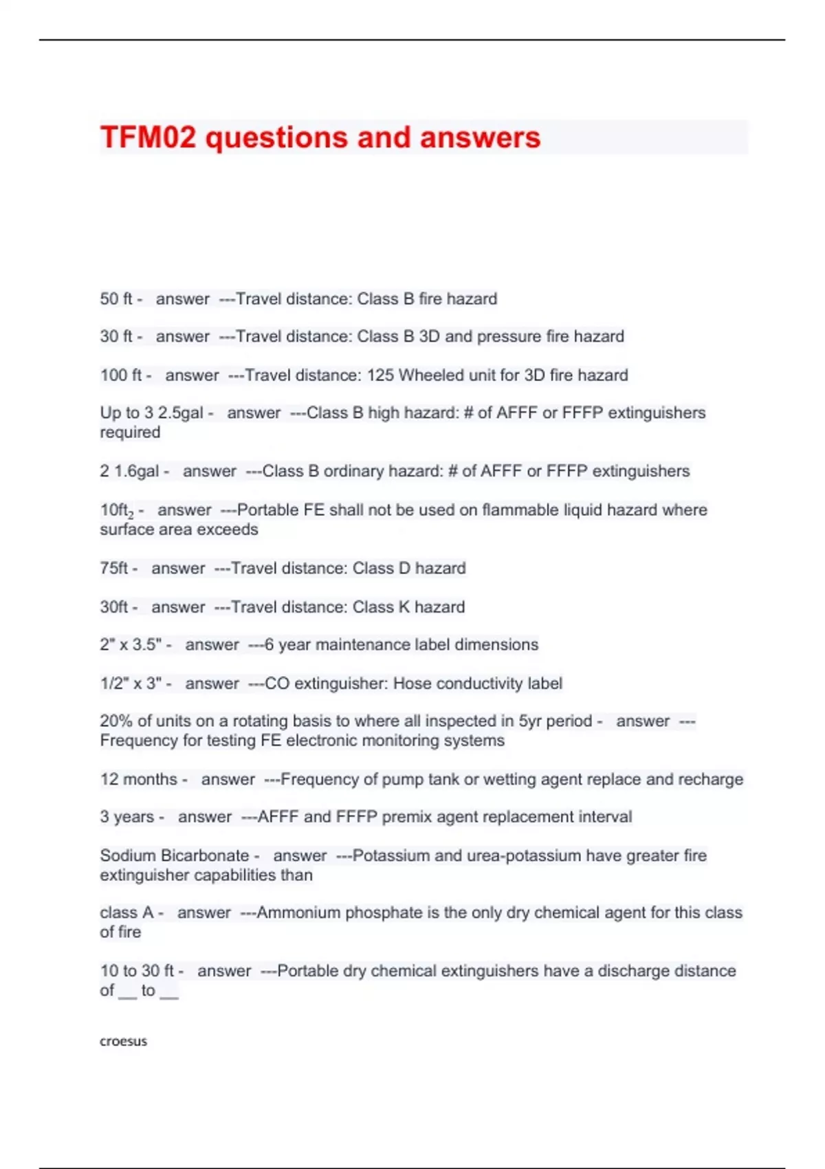 50 ft - answer ---Travel distance: Class B fire hazard 30 ft - answer ---Travel distance: Class B 3D and pressure fire hazard 100 ft - answer ---Travel distance: 125 Wheeled unit for 3D fire hazard Up to 3 2.5gal - answer ---Class B high hazard: # of AFFF or FFFP extinguishers required 2 1.6gal - answer ---Class B ordinary hazard: # of AFFF or FFFP extinguishers 10ft₂ - answer ---Portable FE shall not be used on flammable liquid hazard where surface area exceeds 75ft - answer ---Travel distance: Class D hazard 30ft - answer ---Travel distance: Class K hazard 2" x 3.5" - answer ---6 year maintenance label dimensions 1/2" x 3" - answer ---CO extinguisher: Hose conductivity label 20% of units on a rotating basis to where all inspected in 5yr period - answer ---Frequency for testing FE electronic monitoring systems 12 months - answer ---Frequency of pump tank or wetting agent replace and recharge 3 years - answer ---AFFF and FFFP premix agent replacement interval Sodium Bicarbonate - answer ---Potassium and urea-potassium have greater fire extinguisher capabilities than class A - answer ---Ammonium phosphate is the only dry chemical agent for this class of fire 10 to 30 ft - answer ---Portable dry chemical extinguishers have a discharge distance of __ to __