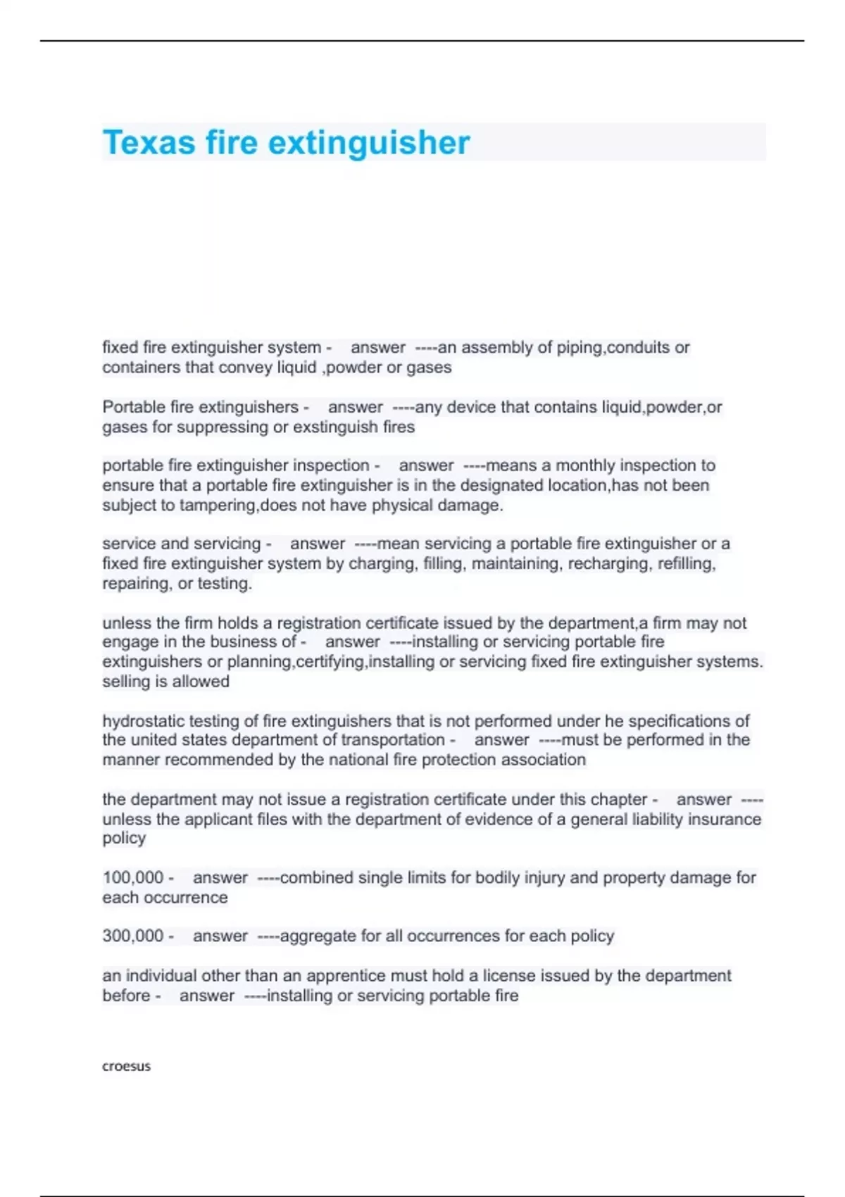 fixed fire extinguisher system - answer ----an assembly of piping,conduits or containers that convey liquid ,powder or gases Portable fire extinguishers - answer ----any device that contains liquid,powder,or gases for suppressing or exstinguish fires portable fire extinguisher inspection - answer ----means a monthly inspection to ensure that a portable fire extinguisher is in the designated location,has not been subject to tampering,does not have physical damage. service and servicing - answer ----mean servicing a portable fire extinguisher or a fixed fire extinguisher system by charging, filling, maintaining, recharging, refilling, repairing, or testing. unless the firm holds a registration certificate issued by the department,a firm may not engage in the business of - answer ----installing or servicing portable fire extinguishers or planning,certifying,installing or servicing fixed fire extinguisher systems. selling is allowed hydrostatic testing of fire extinguishers that is not performed under he specifications of the united states department of transportation - answer ----must be performed in the manner recommended by the national fire protection association the department may not issue a registration certificate under this chapter - answer ----unless the applicant files with the department of evidence of a general liability insurance policy 100,000 - answer ----combined single limits for bodily injury and property damage for each occurrence 300,000 - answer ----aggregate for all occurrences for each policy an individual other than an apprentice must hold a license issued by the department before - answer ----installing or servicing portable fire