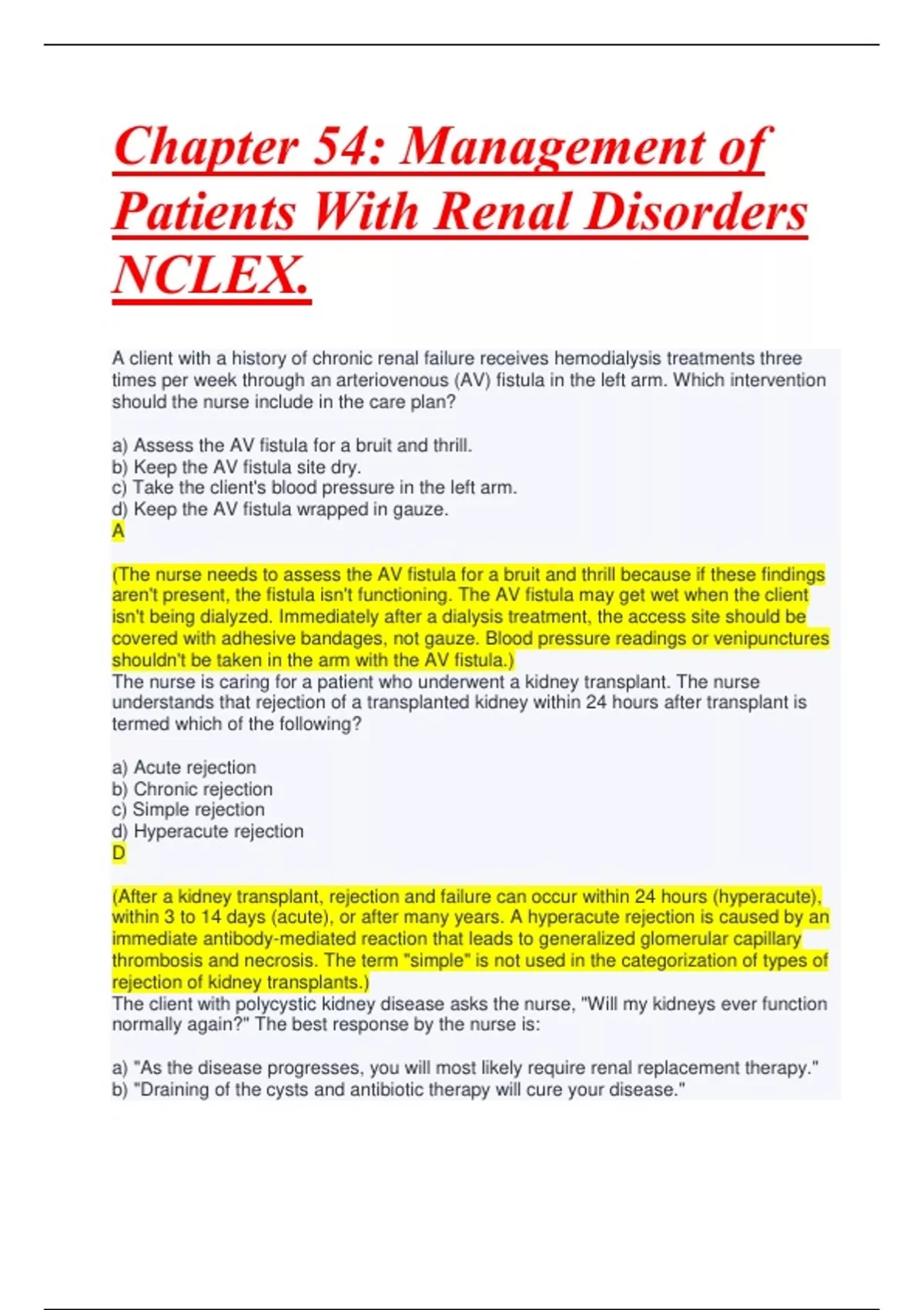 The nurse is caring for a patient who underwent a kidney transplant. The nurse understands that rejection of a transplanted kidney within 24 hours after transplant is termed which of the following? a) Acute rejection b) Chronic rejection c) Simple rejection d) Hyperacute rejection D (After a kidney transplant, rejection and failure can occur within 24 hours (hyperacute), within 3 to 14 days (acute), or after many years. A hyperacute rejection is caused by an immediate antibody-mediated reaction that leads to generalized glomerular capillary thrombosis and necrosis. The term "simple" is not used in the categorization of types of rejection of kidney transplants.) The client with polycystic kidney disease asks the nurse, "Will my kidneys ever function normally again?" The best response by the nurse is: