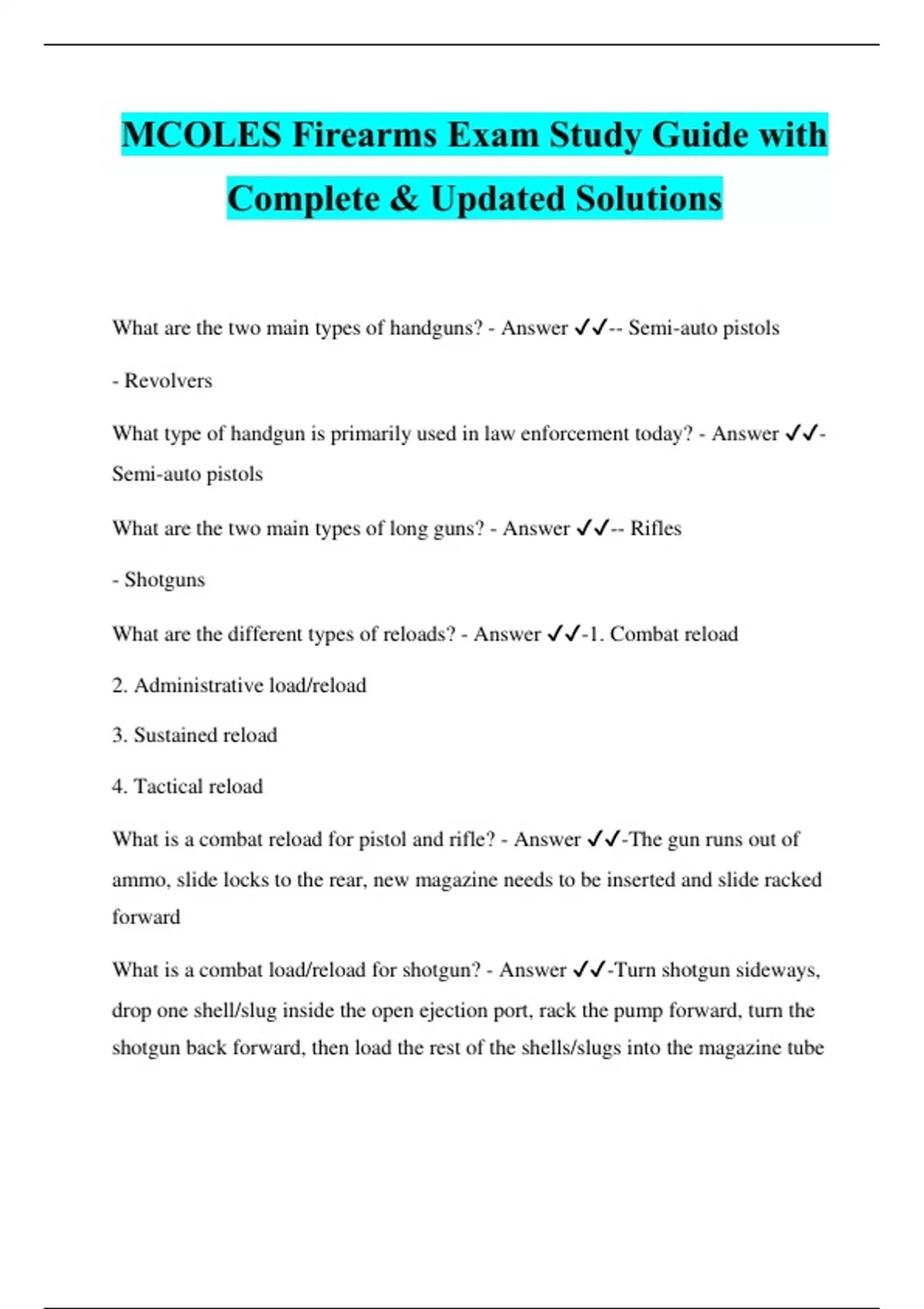 MCOLES Firearms Exam Study Guide with Complete & Updated Solutions What are the two main types of handguns? - Answer ️️ -- Semi-auto pistols - Revolvers What type of handgun is primarily used in law enforcement today? - Answer ️️ - Semi-auto pistols What are the two main types of long guns? - Answer ️️ -- Rifles - Shotguns What are the different types of reloads? - Answer ️️ -1. Combat reload 2. Administrative load/reload 3. Sustained reload 4. Tactical reload What is a combat reload for pistol and rifle? - Answer ️️ -The gun runs out of ammo, slide locks to the rear, new magazine needs to be inserted and slide racked forward What is a combat load/reload for shotgun? - Answer ️️ -Turn shotgun sideways, drop one shell/slug inside the open ejection port, rack the pump forward, turn the shotgun back forward, then load the rest of the shells/slugs into the magazine tube What is an administrative load/reload for pistol? - Answer ️️ -Pistol stays in holster, old magazine stripped out, new magazine placed in without drawing the gun from the holster What is an administrative load/reload for pistol? - Answer ️️ -All shells are loaded one-by-one into the magazine tube What is an administrative load/reload for rifle? - Answer ️️ -Empty chamber, safety on, bolt locked to the rear, magazine is inserted, bolt catch is pressed/slapped What is a sustained reload for pistol and rifle? - Answer ️️ -A round is still in the chamber, the magazine is droppe