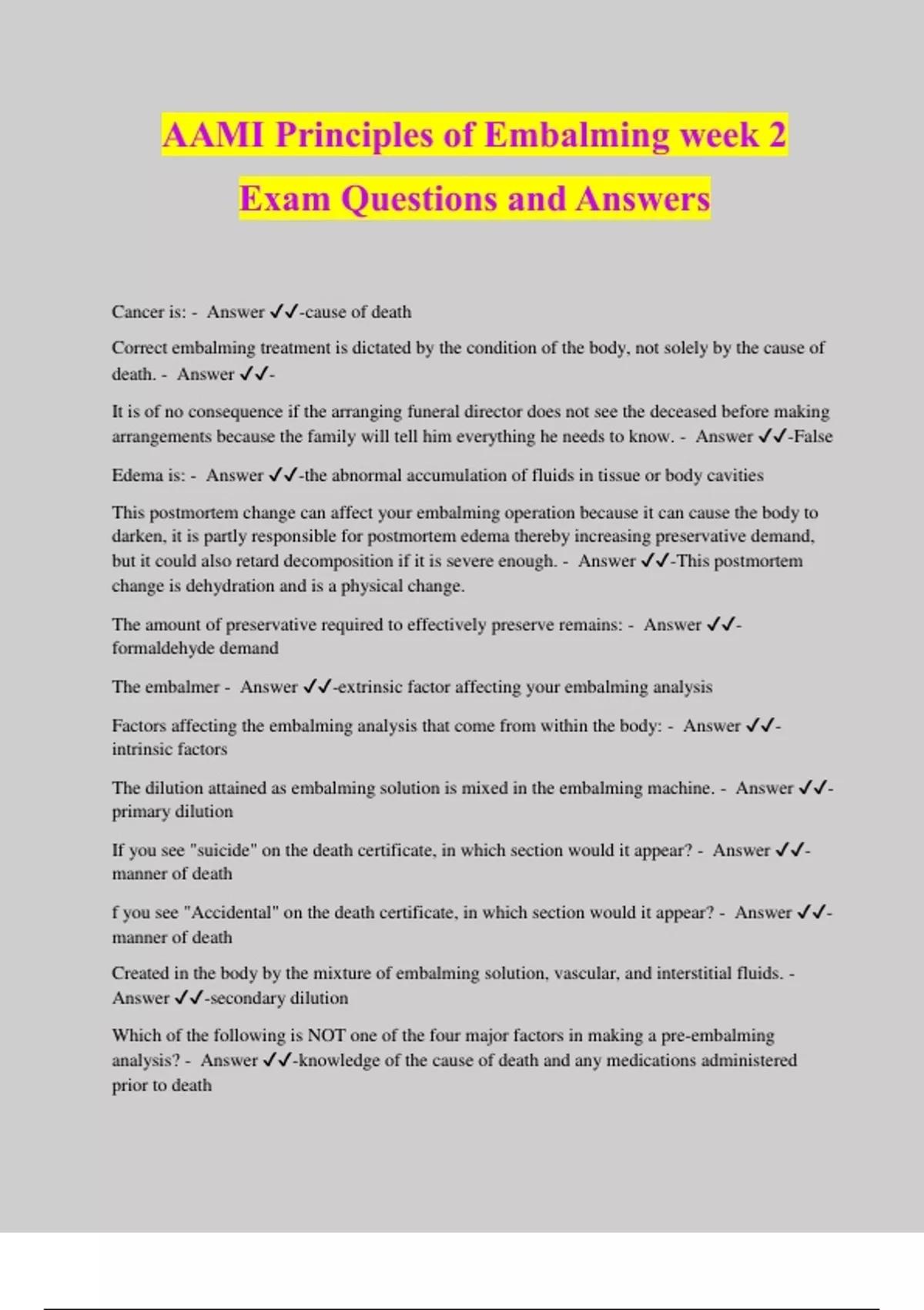 AAMI Principles of Embalming week 2 Exam Questions and Answers Cancer is: - Answer ️️ -cause of death Correct embalming treatment is dictated by the condition of the body, not solely by the cause of death. - Answer ️️ - It is of no consequence if the arranging funeral director does not see the deceased before making arrangements because the family will tell him everything he needs to know. - Answer ️️ -False Edema is: - Answer ️️ -the abnormal accumulation of fluids in tissue or body cavities This postmortem change can affect your embalming operation because it can cause the body to darken, it is partly responsible for postmortem edema thereby increasing preservative demand, but it could also retard decomposition if it is severe enough. - Answer ️️ -This postmortem change is dehydration and is a physical change. The amount of preservative required to effectively preserve remains: - Answer ️️ - formaldehyde demand The embalmer - Answer ️️ -extrinsic factor affecting your embalming analysis Factors affecting the embalming analysis that come from within the body: - Answer ️️ - intrinsic factors The dilution attained as embalming solution is mixed in the embalming machine. - Answer ️️ - primary dilution If you see "suicide" on the death certificate, in which section would it appear? - Answer ️️ - manner of death f you see "Accidental" on the death certificate, in which section would it appear? - Answer ️️ - manner of death Created in the body by the mixture of embalming solution, vascular, and interstitial fluids. - Answer ️️ -secondary dilution Which of the following is NOT one of the four major factors in making a pre-embalming analysis? - Answer ️️ -knowledge of the cause of death and any medications administered prior to death