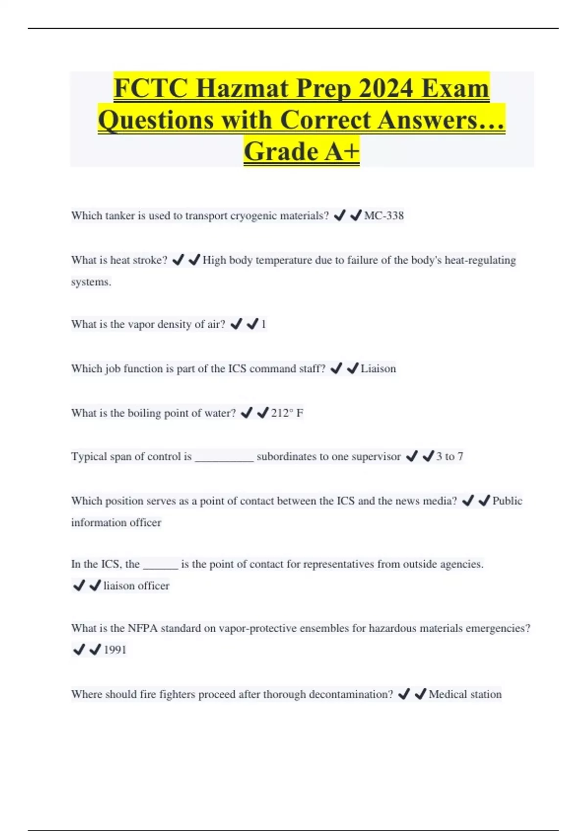 FCTC Hazmat Prep 2024 Exam Questions with Correct Answers… Grade A+ Which tanker is used to transport cryogenic materials? ️️MC-338 What is heat stroke? ️️High body temperature due to failure of the body's heat-regulating systems. What is the vapor density of air? ️️1 Which job function is part of the ICS command staff? ️️Liaison What is the boiling point of water? ️️212° F Typical span of control is __________ subordinates to one supervisor ️️3 to 7