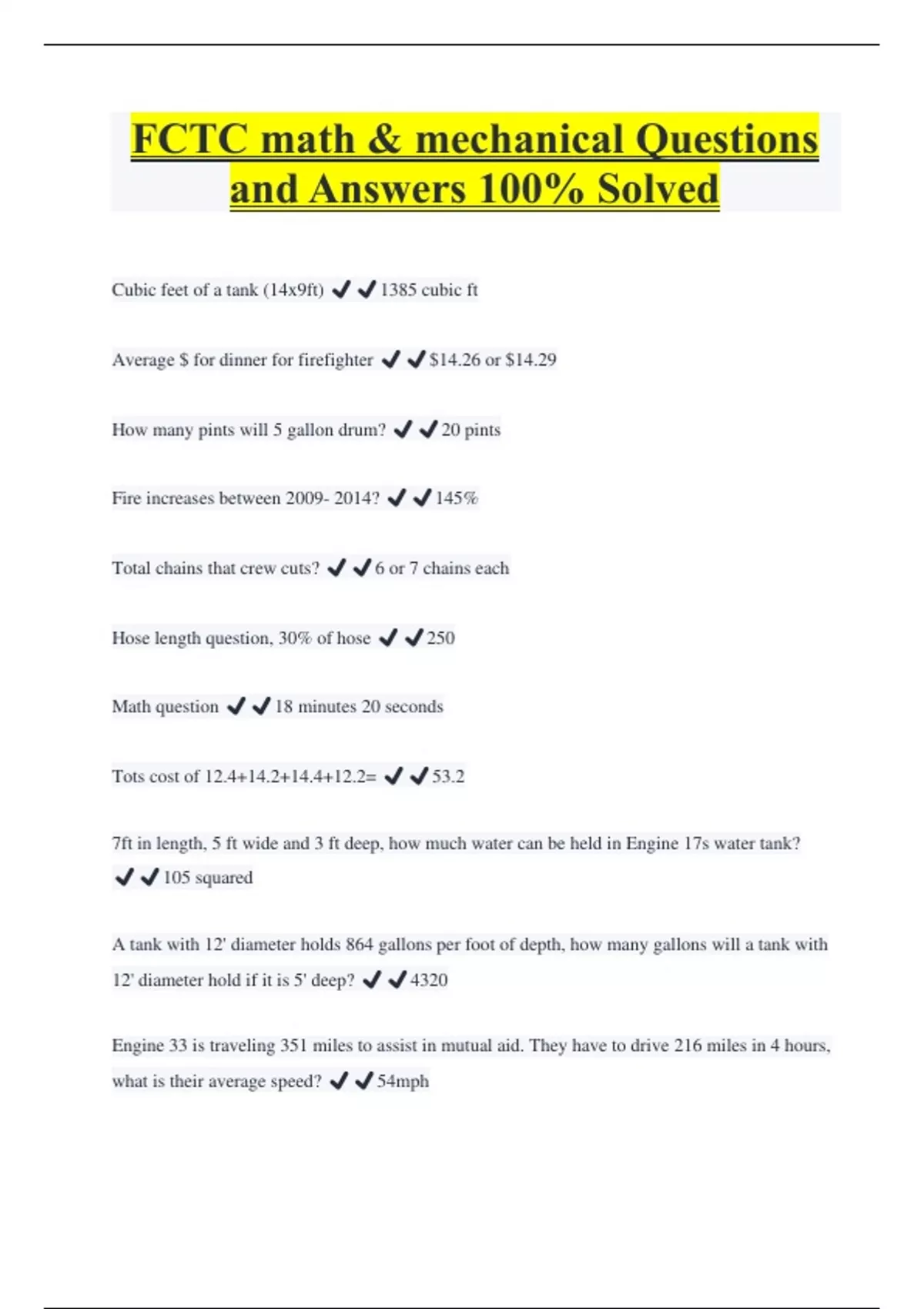 FCTC math & mechanical Questions and Answers 100% Solved Cubic feet of a tank (14x9ft) ️️1385 cubic ft Average $ for dinner for firefighter ️️$14.26 or $14.29 How many pints will 5 gallon drum? ️️20 pints Fire increases between ? ️️145% Total chains that crew cuts? ️️6 or 7 chains each Hose length question, 30% of hose ️️250 Math question ️️18 minutes 20 seconds Tots cost of 12.4+14.2+14.4+12.2= ️️53.2