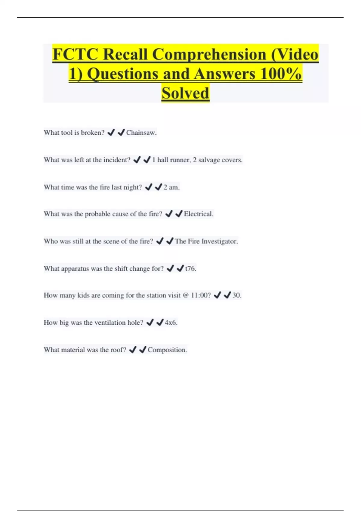 FCTC Recall Comprehension (Video 1) Questions and Answers 100% Solved What tool is broken? ️️Chainsaw. What was left at the incident? ️️1 hall runner, 2 salvage covers. What time was the fire last night? ️️2 am. What was the probable cause of the fire? ️️Electrical