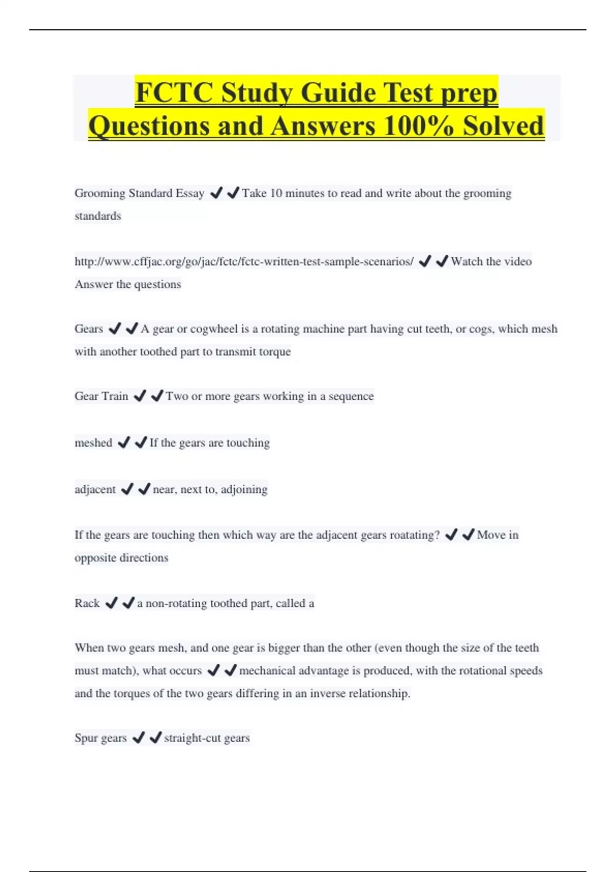 FCTC Study Guide Test prep Questions and Answers 100% Solved Grooming Standard Essay ️️Take 10 minutes to read and write about the grooming standards Answer the questions Gears ️️A gear or cogwheel is a rotating machine part having cut teeth, or cogs, which mesh with another toothed part to transmit torque Gear Train ️️Two or more gears working in a sequence meshed ️️If the gears are touching adjacent ️️near, next to, adjoining