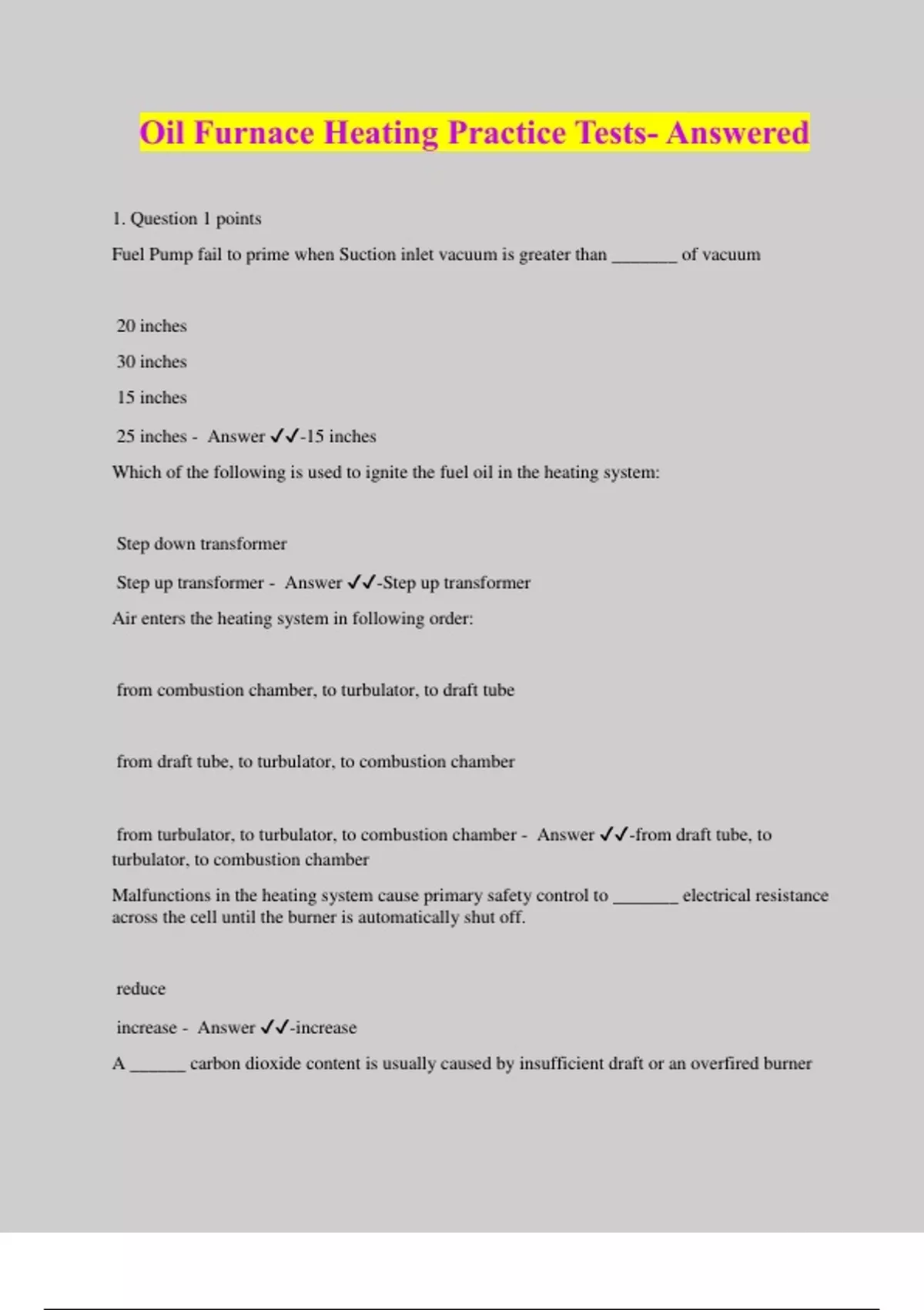 Oil Furnace Heating Practice Tests- Answered 1. Question 1 points Fuel Pump fail to prime when Suction inlet vacuum is greater than _______ of vacuum 20 inches 30 inches 15 inches 25 inches - Answer ️️ -15 inches Which of the following is used to ignite the fuel oil in the heating system: Step down transformer Step up transformer - Answer ️️ -Step up transformer Air enters the heating system in following order: from combustion chamber, to turbulator, to draft tube from draft tube, to turbulator, to combustion chamber from turbulator, to turbulator, to combustion chamber - Answer ️️ -from draft tube, to turbulator, to combustion chamber Malfunctions in the heating system cause primary safety control to _______ electrical resistance across the cell until the burner is automatically shut off. reduce increase - Answer ️️ -increase A ______ carbon dioxide content is usually caused by insufficient draft or an overfired burner