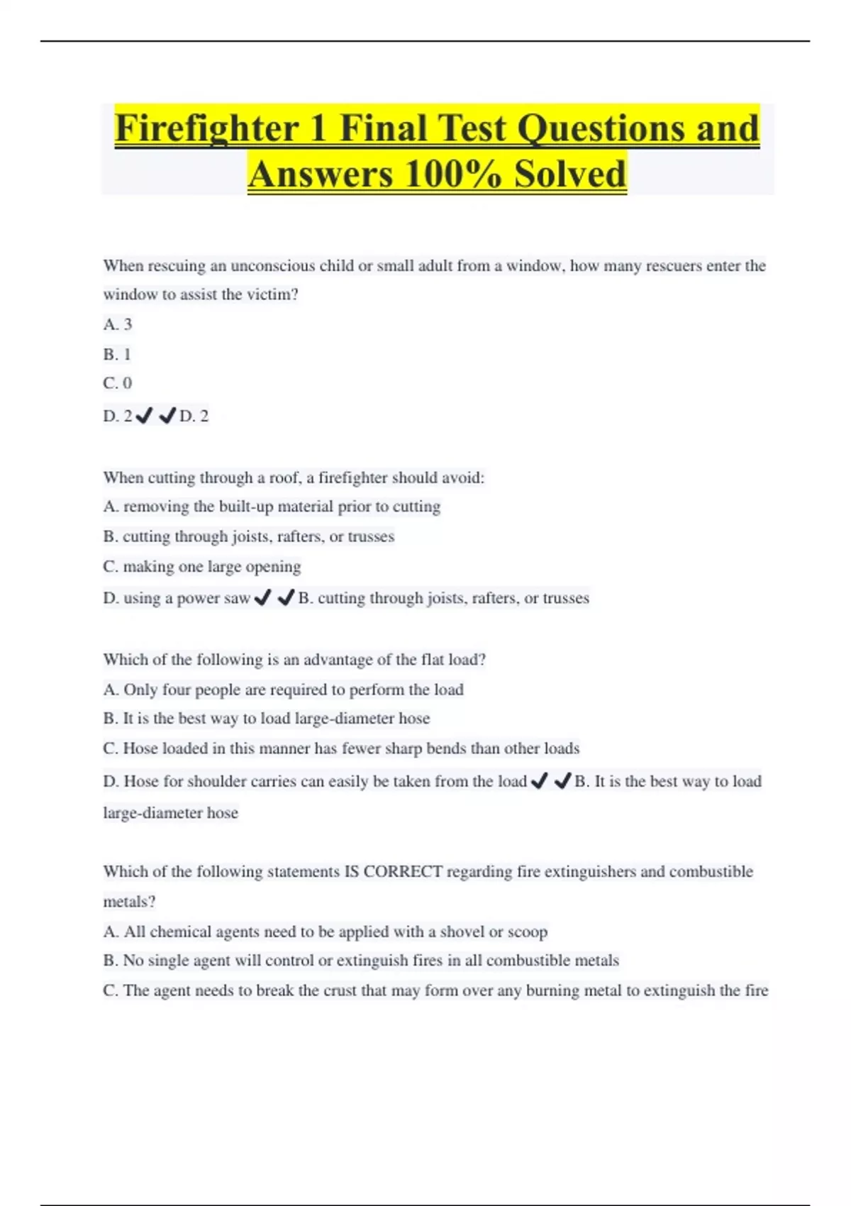 Firefighter 1 Final Test Questions and Answers 100% Solved When rescuing an unconscious child or small adult from a window, how many rescuers enter the window to assist the victim? A. 3 B. 1 C. 0 D. 2️️D. 2 When cutting through a roof, a firefighter should avoid: A. removing the built-up material prior to cutting B. cutting through joists, rafters, or trusses C. making one large opening D. using a power saw️️B. cutting through joists, rafters, or trusses Which of the following is an advantage of the flat load? A. Only four people are required to perform the load B. It is the best way to load large-diameter hose C. Hose loaded in this manner has fewer sharp bends than other loads D. Hose for shoulder carries can easily be taken from the load️️B. It is the best way to load large-diameter hose