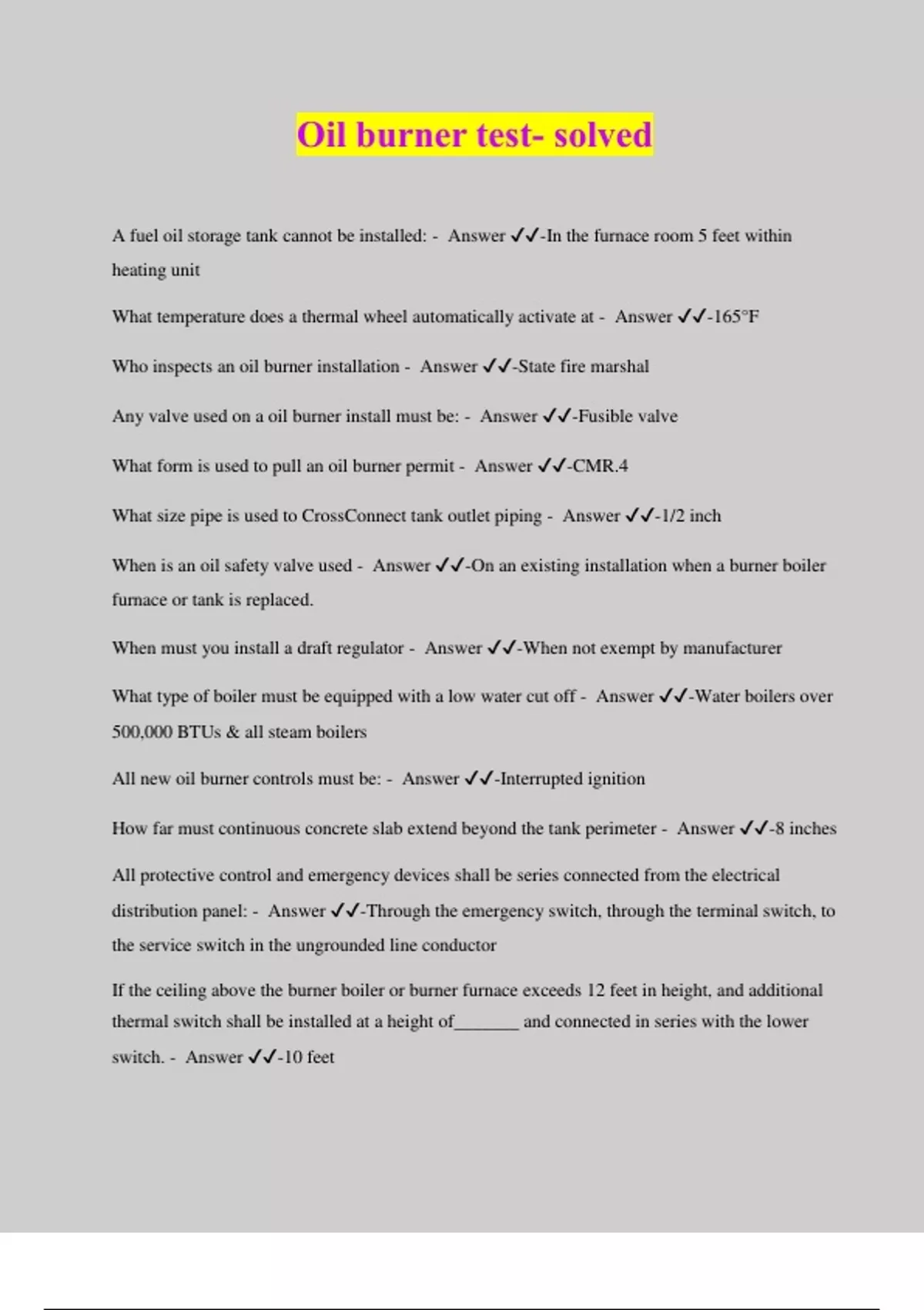 Oil burner test- solved A fuel oil storage tank cannot be installed: - Answer ️️ -In the furnace room 5 feet within heating unit What temperature does a thermal wheel automatically activate at - Answer ️️ -165°F Who inspects an oil burner installation - Answer ️️ -State fire marshal Any valve used on a oil burner install must be: - Answer ️️ -Fusible valve What form is used to pull an oil burner permit - Answer ️️ -CMR.4 What size pipe is used to CrossConnect tank outlet piping - Answer ️️ -1/2 inch When is an oil safety valve used - Answer ️️ -On an existing installation when a burner boiler furnace or tank is replaced. When must you install a draft regulator - Answer ️️ -When not exempt by manufacturer What type of boiler must be equipped with a low water cut off - Answer ️️ -Water boilers over 500,000 BTUs & all steam boilers All new oil burner controls must be: - Answer ️️ -Interrupted ignition How far must continuous concrete slab extend beyond the tank perimeter - Answer ️️ -8 inches All protective control and emergency devices shall be series connected from the electrical distribution panel: - Answer ️️ -Through the emergency switch, through the terminal switch, to the service switch in the ungrounded line conductor If the ceiling above the burner boiler or burner furnace exceeds 12 feet in height, and additional thermal switch shall be installed at a height of_______ and connected in series with the lower switch. - Answer ️️ -10 feet An oil safety valve can perform the following functions: - Answer ️️ -Reduce pressure from its inlet to its outlet & prevent gravity flow Fuel oil filters should be selected for the following: - Answer ️️ -Micron range & flow rate Ultra low sulfur fuel has no benefit to a fuel oil system - Answer ️️ -False To ensure the best mechanical seal throughout a fuel oil delivery system the following should be used: - Answer ️️ -Flared fittings and pipe dope Adding a pre-heater to an oil burner will - Answer ️️ -Allow oil with a high paraffin base to flow more easily & decrease the viscosity of a fuel oil A probe type low-water cut off for steam should be checked - Answer ️️ -Once a year The proper value for a resistor used to verify the F-F terminals of a Honeywell primary control should be - Answer ️️ -1500 ohm