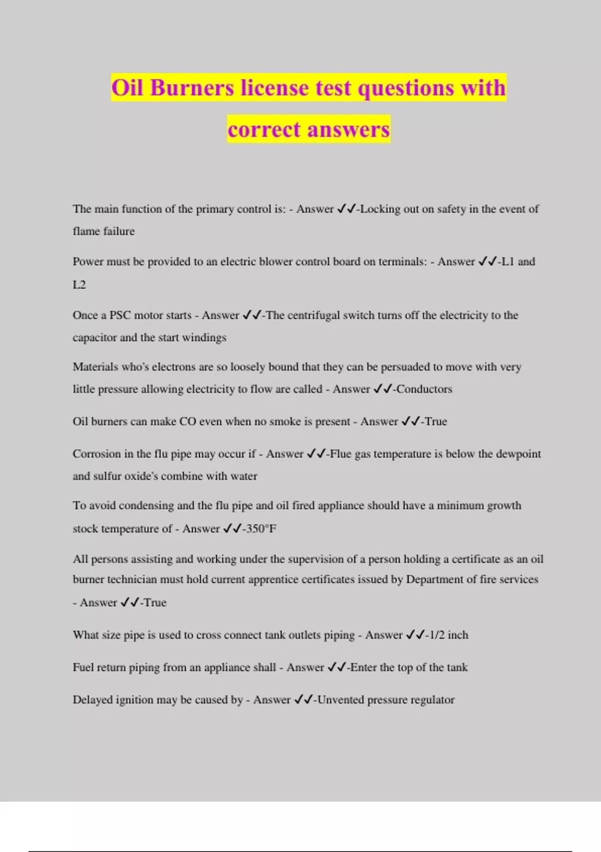 Oil Burners license test questions with correct answers The main function of the primary control is: - Answer ️️ -Locking out on safety in the event of flame failure Power must be provided to an electric blower control board on terminals: - Answer ️️ -L1 and L2 Once a PSC motor starts - Answer ️️ -The centrifugal switch turns off the electricity to the capacitor and the start windings Materials who's electrons are so loosely bound that they can be persuaded to move with very little pressure allowing electricity to flow are called - Answer ️️ -Conductors Oil burners can make CO even when no smoke is present - Answer ️️ -True Corrosion in the flu pipe may occur if - Answer ️️ -Flue gas temperature is below the dewpoint and sulfur oxide's combine with water To avoid condensing and the flu pipe and oil fired appliance should have a minimum growth stock temperature of - Answer ️️ -350°F All persons assisting and working under the supervision of a person holding a certificate as an oil burner technician must hold current apprentice certificates issued by Department of fire services - Answer ️️ -True What size pipe is used to cross connect tank outlets piping - Answer ️️ -1/2 inch Fuel return piping from an appliance shall - Answer ️️ -Enter the top of the tank Delayed ignition may be caused by - Answer ️️ -Unvented pressure regulator Installation of oil safety valves and oil pressure reducing valve - Answer ️️ -Reduces the chance of a return line leak What is an installation - Answer ️️ -Complete and ready for operation of any oil burning appliance Energizing the ignition circuit during the entire burn cycle reduces - Answer ️️ -Ignition component life Fuel can be transferred from a tank to an appliance by pressurizing the tank - Answer ️️ -False What device must be equipped with an air proving switch - Answer ️️ -Both, draft inducers and power-venters What is a safety control - Answer ️️ -Any control used to prevent unsafe operation of the controlled equipment A non-resident steam or hot water boiler having a minimum safety relief valve capacity over 200,000 BTU/hr requires certificate of inspection from the department of fire services - Answer ️️ -Prior to the initial firing, every 3 years