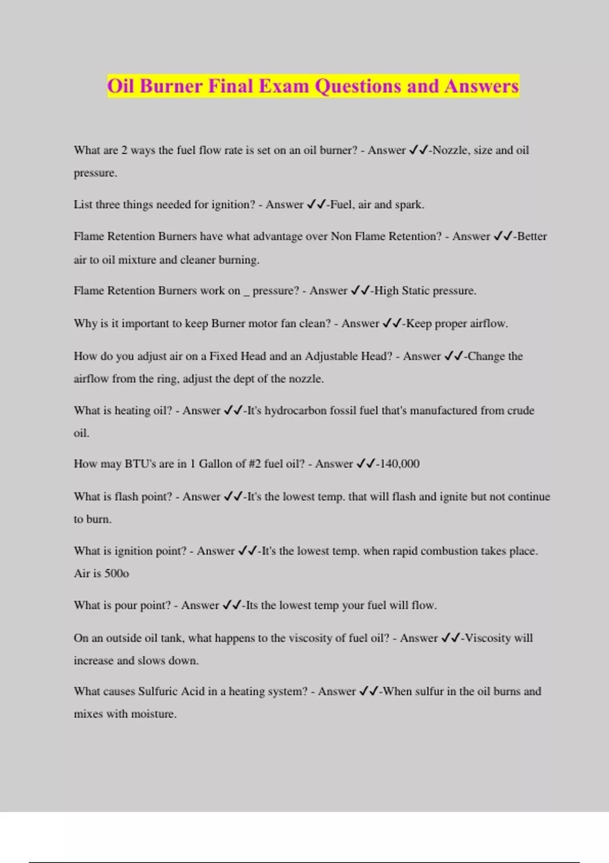 Oil Burner Final Exam Questions and Answers What are 2 ways the fuel flow rate is set on an oil burner? - Answer ️️ -Nozzle, size and oil pressure. List three things needed for ignition? - Answer ️️ -Fuel, air and spark. Flame Retention Burners have what advantage over Non Flame Retention? - Answer ️️ -Better air to oil mixture and cleaner burning. Flame Retention Burners work on _ pressure? - Answer ️️ -High Static pressure. Why is it important to keep Burner motor fan clean? - Answer ️️ -Keep proper airflow. How do you adjust air on a Fixed Head and an Adjustable Head? - Answer ️️ -Change the airflow from the ring, adjust the dept of the nozzle. What is heating oil? - Answer ️️ -It's hydrocarbon fossil fuel that's manufactured from crude oil. How may BTU's are in 1 Gallon of #2 fuel oil? - Answer ️️ -140,000 What is flash point? - Answer ️️ -It's the lowest temp. that will flash and ignite but not continue to burn. What is ignition point? - Answer ️️ -It's the lowest temp. when rapid combustion takes place. Air is 500o What is pour point? - Answer ️️ -Its the lowest temp your fuel will flow. On an outside oil tank, what happens to the viscosity of fuel oil? - Answer ️️ -Viscosity will increase and slows down. What causes Sulfuric Acid in a heating system? - Answer ️️ -When sulfur in the oil burns and mixes with moisture
