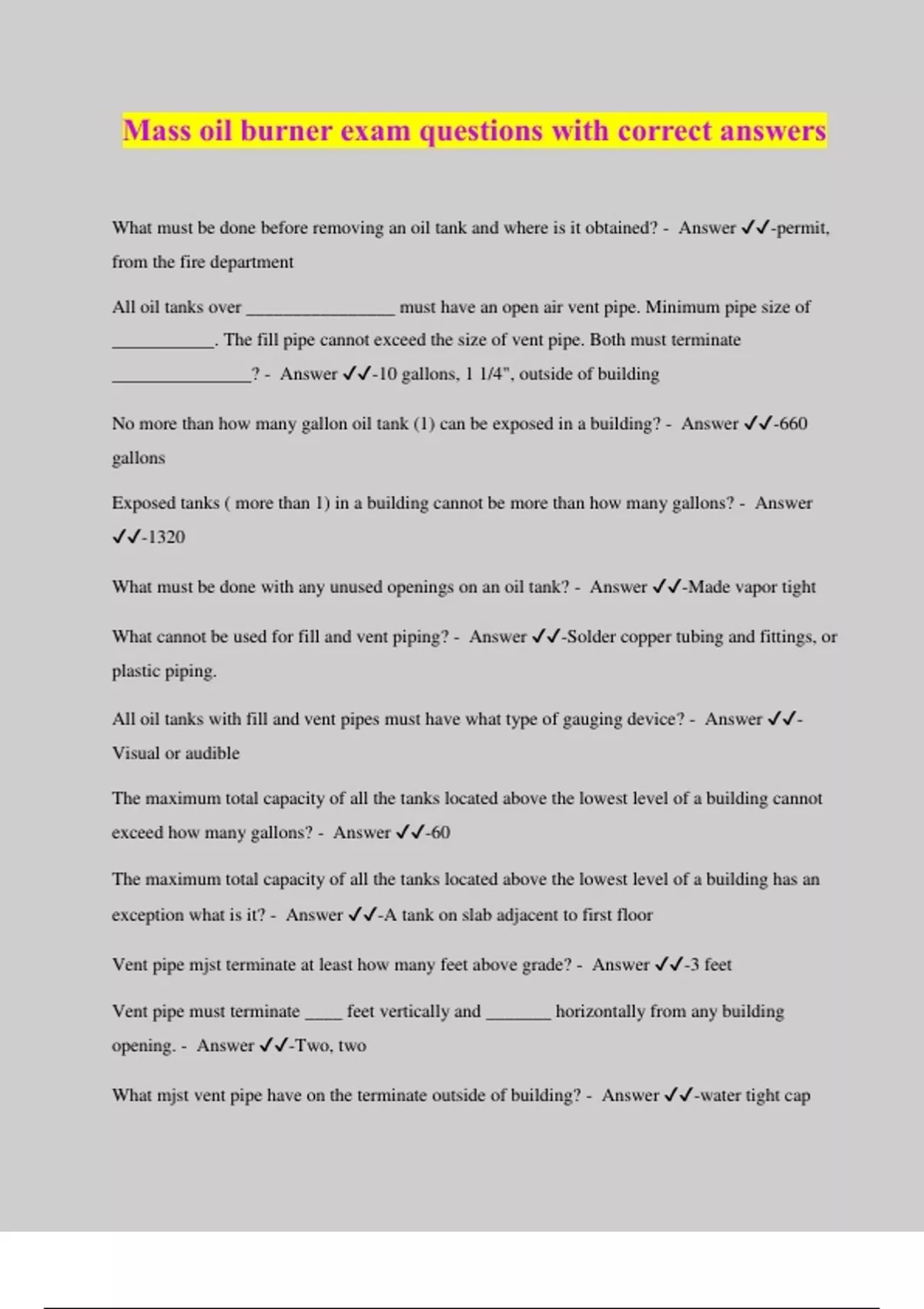 Mass oil burner exam questions with correct answers What must be done before removing an oil tank and where is it obtained? - Answer ️️ -permit, from the fire department All oil tanks over ________________ must have an open air vent pipe. Minimum pipe size of ___________. The fill pipe cannot exceed the size of vent pipe. Both must terminate _______________? - Answer ️️ -10 gallons, 1 1/4", outside of building No more than how many gallon oil tank (1) can be exposed in a building? - Answer ️️ -660 gallons Exposed tanks ( more than 1) in a building cannot be more than how many gallons? - Answer ️️ -1320 What must be done with any unused openings on an oil tank? - Answer ️️ -Made vapor tight What cannot be used for fill and vent piping? - Answer ️️ -Solder copper tubing and fittings, or plastic piping. All oil tanks with fill and vent pipes must have what type of gauging device? - Answer ️️ - Visual or audible The maximum total capacity of all the tanks located above the lowest level of a building cannot exceed how many gallons? - Answer ️️ -60 The maximum total capacity of all the tanks located above the lowest level of a building has an exception what is it? - Answer ️️ -A tank on slab adjacent to first floor Vent pipe mjst terminate at least how many feet above grade? - Answer ️️ -3 feet Vent pipe must terminate ____ feet vertically and _______ horizontally from any building opening. - Answer ️️ -Two, two What mjst vent pipe have on the terminate outside of building? - Answer ️️ -water tight cap