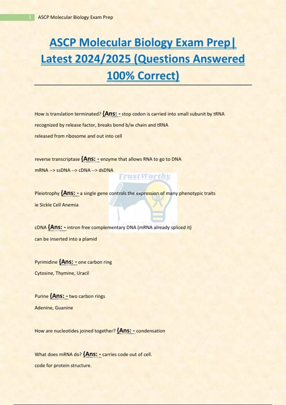 ASCP Molecular Biology Exam Prep| Latest 2024/2025 (Questions Answered 100% Correct)