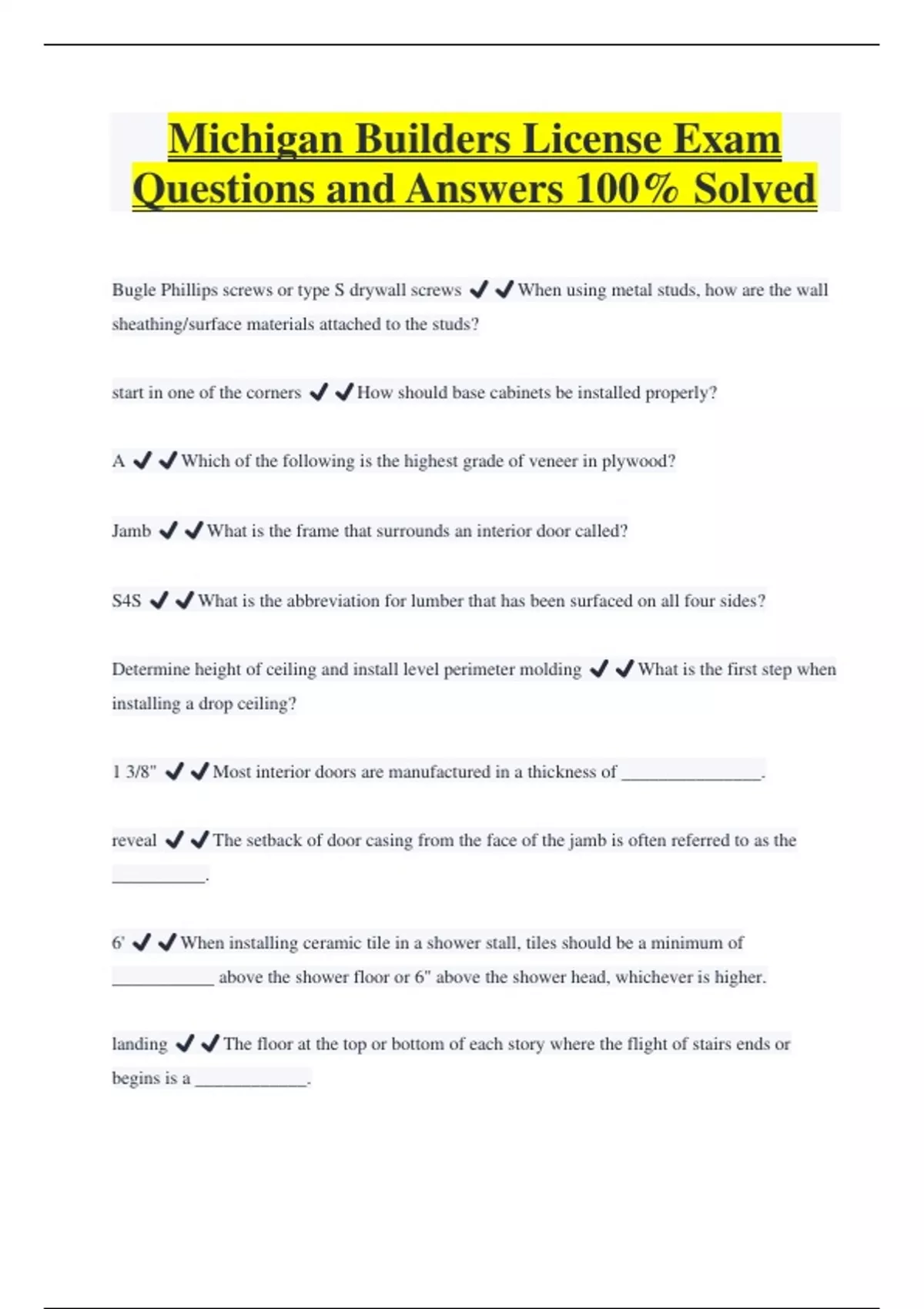 Michigan Builders License Exam Questions and Answers 100% Solved Bugle Phillips screws or type S drywall screws ️️When using metal studs, how are the wall sheathing/surface materials attached to the studs? start in one of the corners ️️How should base cabinets be installed properly? A ️️Which of the following is the highest grade of veneer in plywood? Jamb ️️What is the frame that surrounds an interior door called? S4S ️️What is the abbreviation for lumber that has been surfaced on all four sides? Determine height of ceiling and install level perimeter molding ️️What is the first step when installing a drop ceiling? 1 3/8" ️️Most interior doors are manufactured in a thickness of _