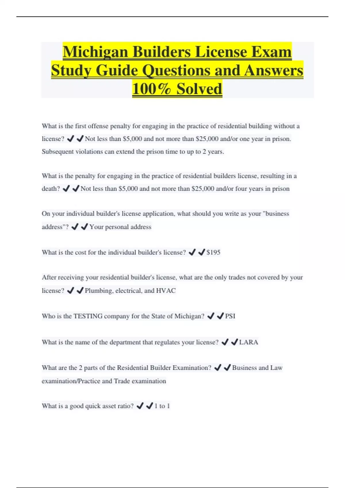 Michigan Builders License Exam Study Guide Questions and Answers 100% Solved What is the first offense penalty for engaging in the practice of residential building without a license? ️️Not less than $5,000 and not more than $25,000 and/or one year in prison. Subsequent violations can extend the prison time to up to 2 years. What is the penalty for engaging in the practice of residential builders license, resulting in a death? ️️Not less than $5,000 and not more than $25,000 and/or four years in prison On your individual builder's license application, what should you write as your "business address"? ️️Your personal address What is the cost for the individual builder's license? ️️$195 After receiving your residential builder's license, what are the only trades not covered by your license? ️️Plumbing, electrical, and HVAC Who is the TESTING company for the State of Michigan? ️️PSI