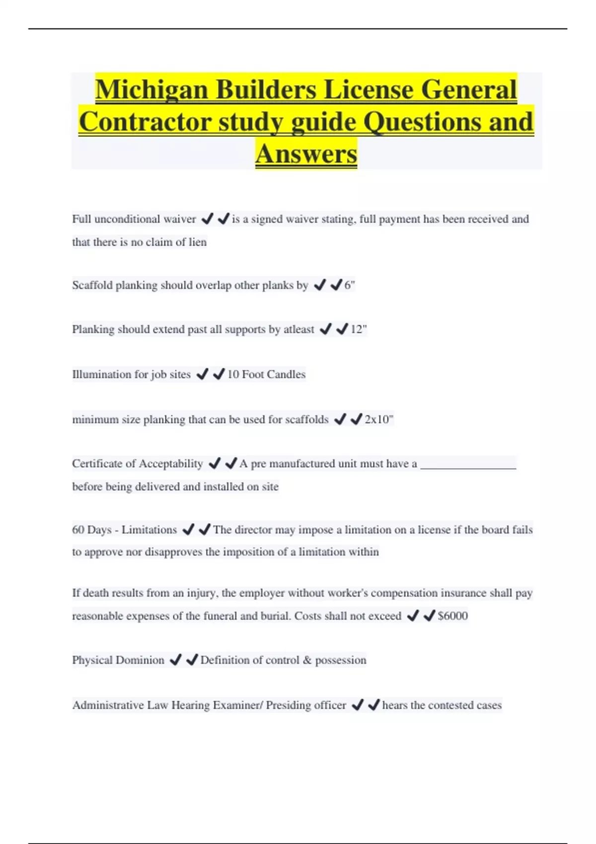 Michigan Builders License General Contractor study guide Questions and Answers Full unconditional waiver ️️is a signed waiver stating, full payment has been received and that there is no claim of lien Scaffold planking should overlap other planks by ️️6" Planking should extend past all supports by atleast ️️12" Illumination for job sites ️️10 Foot Candles minimum size planking that can be used for scaffolds ️️2x10" Certificate of Acceptability ️️A pre manufactured unit must have a ________________ before being delivered and installed on site