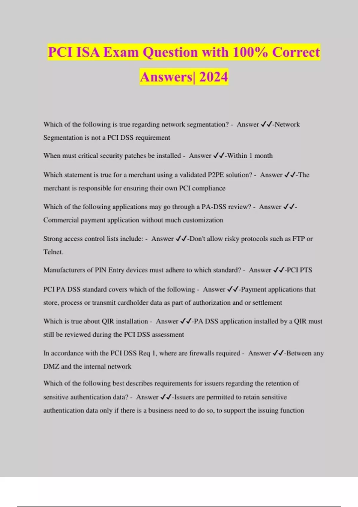PCI ISA Exam Question with 100% Correct Answers| 2024 Which of the following is true regarding network segmentation? - Answer ️️ -Network Segmentation is not a PCI DSS requirement When must critical security patches be installed - Answer ️️ -Within 1 month Which statement is true for a merchant using a validated P2PE solution? - Answer ️️ -The merchant is responsible for ensuring their own PCI compliance Which of the following applications may go through a PA-DSS review? - Answer ️️ - Commercial payment application without much customization Strong access control lists include: - Answer ️️ -Don't allow risky protocols such as FTP or Telnet. Manufacturers of PIN Entry devices must adhere to which standard? - Answer ️️ -PCI PTS PCI PA DSS standard covers which of the following - Answer ️️ -Payment applications that store, process or transmit cardholder data as part of authorization and or settlement Which is true about QIR installation - Answer ️️ -PA DSS application installed by a QIR must still be reviewed during the PCI DSS assessment In accordance with the PCI DSS Req 1, where are firewalls required - Answer ️️ -Between any DMZ and the internal network