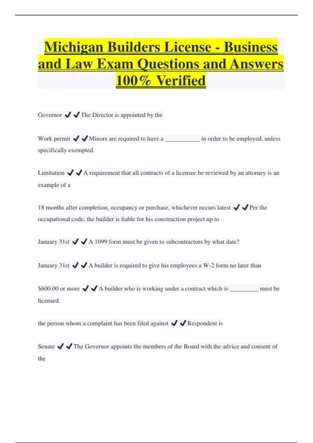 Michigan Builders License - Business and Law Exam Questions and Answers 100% Verified Governor ️️The Director is appointed by the Work permit ️️Minors are required to have a ___________ in order to be employed, unless specifically exempted. Limitation ️️A requirement that all contracts of a licensee be reviewed by an attorney is an example of a 18 months after completion, occupancy or purchase, whichever occurs latest ️️Per the occupational code, the builder is liable for his construction project up to January 31st ️️A 1099 form must be given to subcontractors by what date? January 31st ️️A builder is required to give his employees a W-2 form no later than $600.00 or more ️️A builder who is working under a contract which is _________ must be licensed