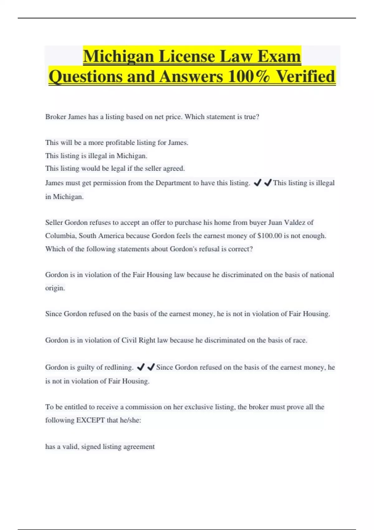 Michigan License Law Exam Questions and Answers 100% Verified Broker James has a listing based on net price. Which statement is true? This will be a more profitable listing for James. This listing is illegal in Michigan. This listing would be legal if the seller agreed. James must get permission from the Department to have this listing. ️️This listing is illegal in Michigan. Seller Gordon refuses to accept an offer to purchase his home from buyer Juan Valdez of Columbia, South America because Gordon feels the earnest money of $100.00 is not enough. Which of the following statements about Gordon's refusal is correct? Gordon is in violation of the Fair Housing law because he discriminated on the basis of national origin