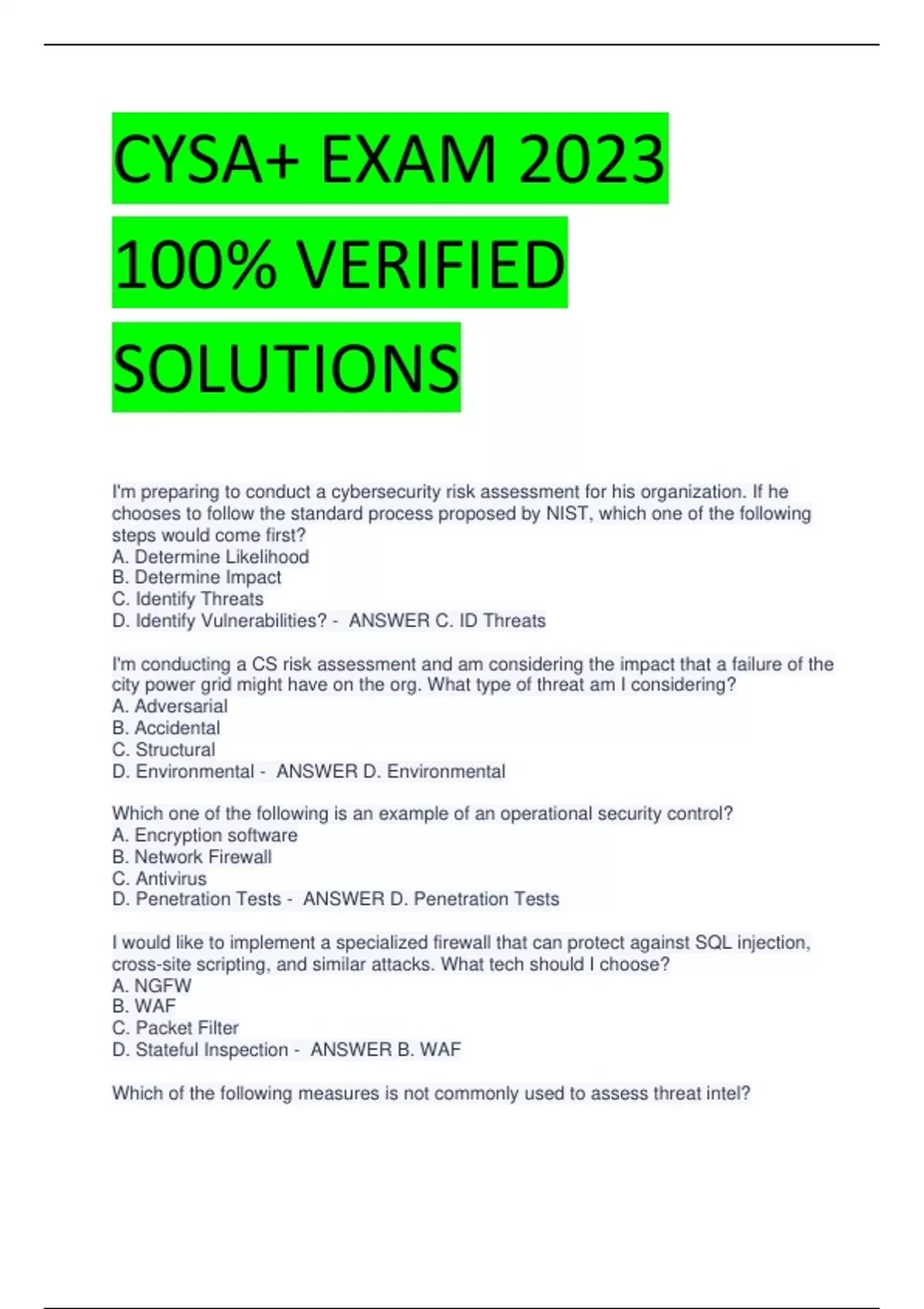 CYSA+ EXAM 2023 100% VERIFIED SOLUTIONS I'm preparing to conduct a cybersecurity risk assessment for his organization. If he chooses to follow the standard process proposed by NIST, which one of the following steps would come first? A. Determine Likelihood B. Determine Impact C. Identify Threats D. Identify Vulnerabilities? - ANSWER C. ID Threats I'm conducting a CS risk assessment and am considering the impact that a failure of the city power grid might have on the org. What type of threat am I considering? A. Adversarial B. Accidental C. Structural D. Environmental - ANSWER D. Environmental Which one of the following is an example of an operational security control? A. Encryption software B. Network Firewall C. Antivirus D. Penetration Tests - ANSWER D. Penetration Tests I would like to implement a specialized firewall that can protect against SQL injection, cross-site scripting, and similar attacks. What tech should I choose? A. NGFW B. WAF C. Packet Filter D. Stateful Inspection - ANSWER B. WAF Which of the following measures is not commonly used to assess threat intel? A. Timeliness B. Detail C. Accuracy D. Relevance - ANSWER B. Detail I want to send threat info via a standardized protocol specifically designed to exchange cyberthreat info. What should I choose? A. STIX 1.0 B. OpenIOC C. STIX 2.0 D. TAXII - ANSWER D. TAXII What phase of the Cyber Kill Chain includes creation of persistent backdoor access for attackers? A. Delivery B. Exploitation C. Installation D. C2 - ANSWER C. Installation What common criticism is leveled at the Cyber Kill Chain? A. Not all threats are aimed at a kill. B. It is too detailed. C. It includes actions outside of the defended network. D. It focuses too much on insider threats. - ANSWER C. It includes actions outside of the defended network. Which of the following is not a common technique used to defend against command and control (C2) capabilities deployed by attackers? A. Network Hardending B. Patching against zero-day attacks C. Deploying detection capabilities D. Tracking new C2 methods and technology - ANSWER B. Patching against zero-day attacks What drove the creation of ISACs in the US? A. Threat info sharing for infrastructure owners B. The Cybersecurity Act of 1994 C. Threat info collection network providers D. The 1998 ISAC Act - ANSWER A. Threat info sharing for infrastructure owners OpenIOC uses a base set of indicators of compromise originally created and provided by which security company? A. Mandiant B. McAfee C. CrowdStrike D. Cisco - ANSWER A. Mandiant I want to select a threat framework for my org, and identifying threat actor tactics in a standardized way is an important part of my selection process. Which threat model would be my best choice? A. The Diamond Model B. ATT&CK C. The Cyber Kill Chain D. The Universal Threat Model - ANSWER B. ATT&CK Forensic data is most often used for what type of threat assessment data? A. STIX B. Behavioral C. IOCs D. TAXII - ANSWER C. IOCs What flag does nmap use to enable operating system identification? A. -os B. -id C. -o D. -osscan - ANS