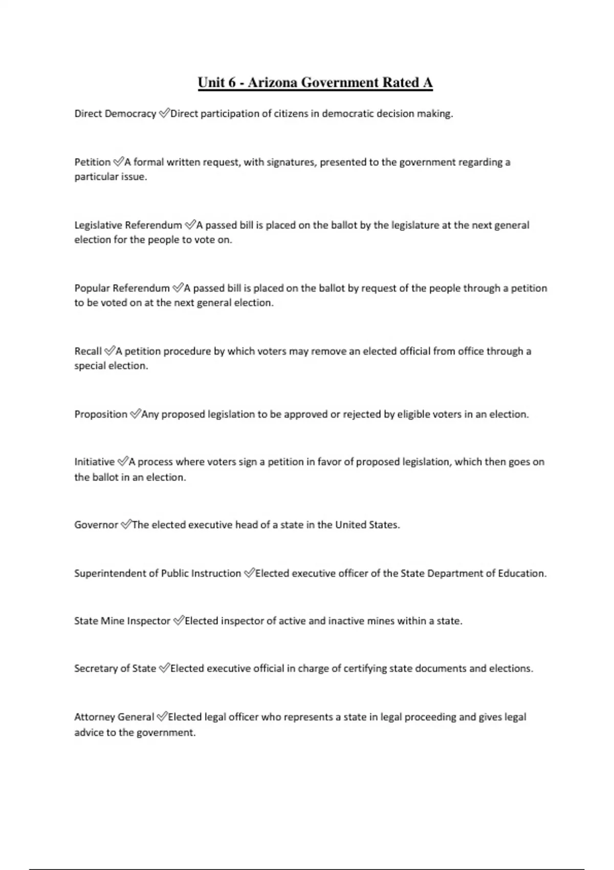 Unit 6 - Arizona Government Rated A Direct Democracy Direct participation of citizens in democratic decision making. Petition A formal written request, with signatures, presented to the government regarding a particular issue. Legislative Referendum A passed bill is placed on the ballot by the legislature at the next general election for the people to vote on. Popular Referendum A passed bill is placed on the ballot by request of the people through a petition to be voted on at the next general election. Recall A petition procedure by which voters may remove an elected official from office through a special election. Proposition Any proposed legislation to be approved or rejected by eligible voters in an election. Initiative A process where voters sign a petition in favor of proposed legislation, which then goes on the ballot in an election. Governor The elected executive head of a state in the United States. Superintendent of Public Instruction Elected executive officer of the State Department of Education.