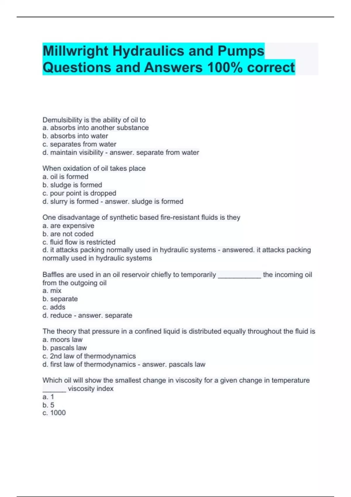 Millwright Hydraulics and Pumps Questions and Answers 100% correct Demulsibility is the ability of oil to a. absorb into another substance b. absorb into water c. separate from water d. maintain visibility c. seperate from water When oxidation of oil takes place a. oil is formed b. sludge is formed c. pour point is dropped d. slurry is formed a. sludge is formed Brainpower Read More Previous Play Next Rewind 10 seconds Move forward 10 seconds Unmute 0:08 / 0:15 Full screen One disadvantage of synthetic based fire resistant fluids is they a. are expensive b. are not coded c. fluid flow is restricted d. it attacks packing normally used in hydraulic systems d. it attacks packing normally used in hydraulic systems Baffles are used in an oil reservoir chiefly to temporarily ___________ the incoming oil from the outgoing oil a. mix b. seperate c. add d. reduce b. seperate The theory that pressure in a confined liquid is distributed equally throughout the fluid is a. moores law b. pascals law c. 2nd law of thermodynamincs d. first law of thermodynamics b. pascals law Which oil will show the smallest change in viscosity for a given change in temperature ______ viscosity index a. 1 b. 5 c. 1000 d. 100 A. 1 The emmerision (sump type) pump is connected to the ______ of the pump a. discharge b. overhead line c. suction line d. intake c. suction line The term full flow filter means a. there is full flow b. there is full flow of oil c. there is no flow d. oil passes through the filter d. oil passes through the filter Pressure in a hydraulic system is created by the ______________ of fluid flow a. presence b. initiation c. resistance to fluid d. resistance to fluid flow resistance to fluid flow
