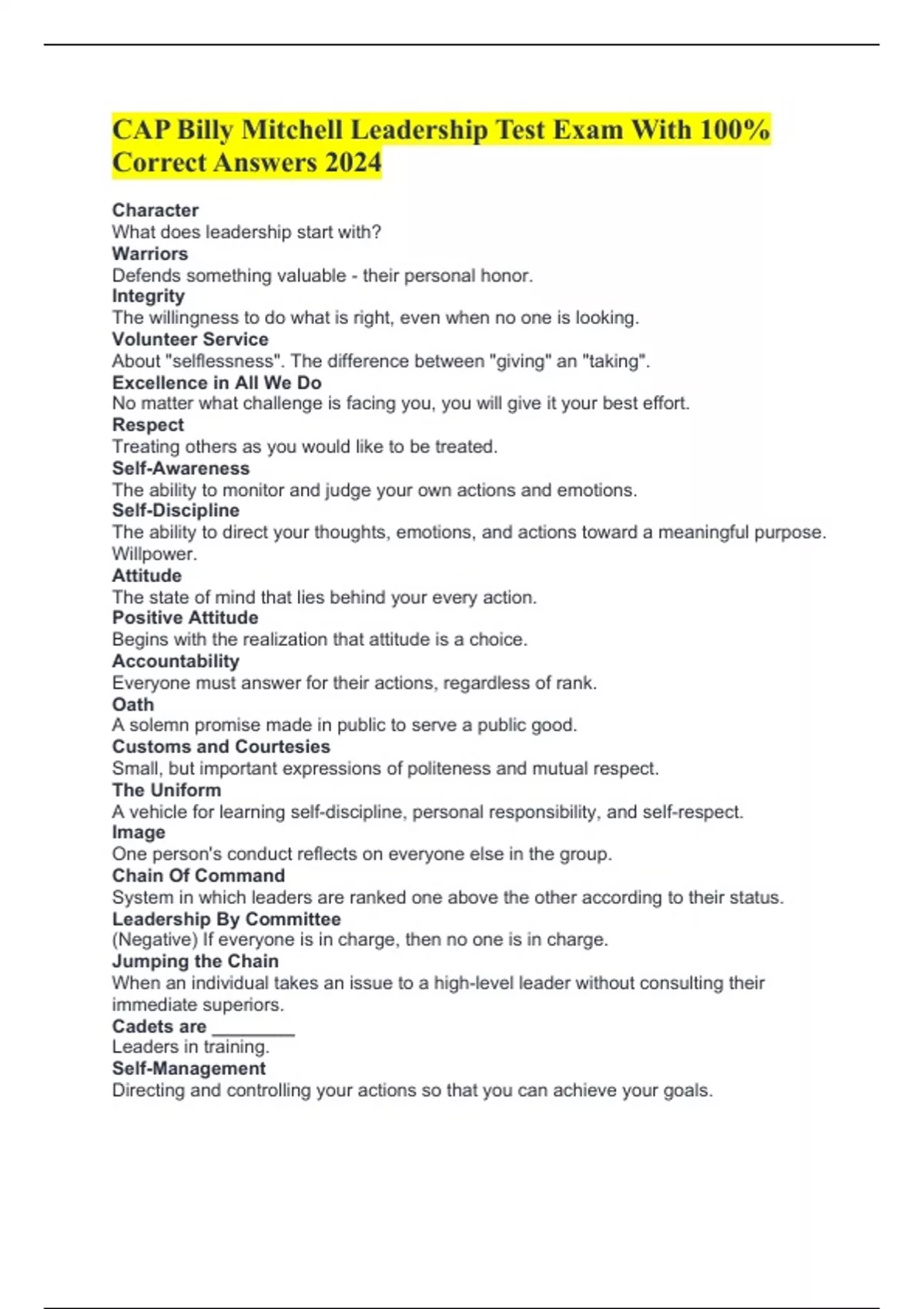 CAP Billy Mitchell Leadership Test Exam With 100% Correct Answers 2024 Character What does leadership start with? Warriors Defends something valuable - their personal honor. Integrity The willingness to do what is right, even when no one is looking. Volunteer Service About "selflessness". The difference between "giving" an "taking". Excellence in All We Do No matter what challenge is facing you, you will give it your best effort. Respect Treating others as you would like to be treated. Self-Awareness The ability to monitor and judge your own actions and emotions. Self-Discipline The ability to direct your thoughts, emotions, and actions toward a meaningful purpose. Willpower. Attitude The state of mind that lies behind your every action. Positive Attitude Begins with the realization that attitude is a choice. Accountability Everyone must answer for their actions, regardless of rank. Oath A solemn promise made in public to serve a public good. Customs and Courtesies Small, but important expressions of politeness and mutual respect. The Uniform A vehicle for learning self-discipline, personal responsibility, and self-respect. Image One person's conduct reflects on everyone else in the group. Chain Of Command System in which leaders are ranked one above the other according to their status. Leadership By Committee (Negative) If everyone is in charge, then no one is in charge. Jumping the Chain When an individual takes an issue to a high-level leader without consulting their immediate superiors. Cadets are ________ Leaders in training. Self-Management Directing and controlling your actions so that you can achieve your goals. A goal is a Dream with a deadline. Future Picture Clear and Compelling description of what you want your life to look like at some point in the future. Fact 2+2=4 Opinion B-2 Spirit is the world's greatest airplane. Assumption Cadets who exercise regularly will pass the fitness test. Brainstorming A method of generating a large number of creative ideas. Stakeholders People who have a direct or indirect interest in the issue. Time Management The process of organizing and using your time wisely. Efficiency How well a leader is making use of their time and other resources. Uptime The amount of time they are actually working. Downtime Time spent waiting for the opportunity to work. Procrastination The process of putting off for no good reason a task that should be done right now. Stress The body's response to change. Stressor Anything that causes stress. Resilience The ability to bounce back and recover from adversity. How many hours of sleep should teens be getting per night? 9-10 Hours Team A collection of individuals who are committed to working together to achieve a common goal. Synergy The idea that by working together, a team can achieve more than each individual could on their own. Teamwork requires... Sacrifice What does TEAM stand for? Together Everyone Achieves More What is contagious? Enthusiasm Loyal
