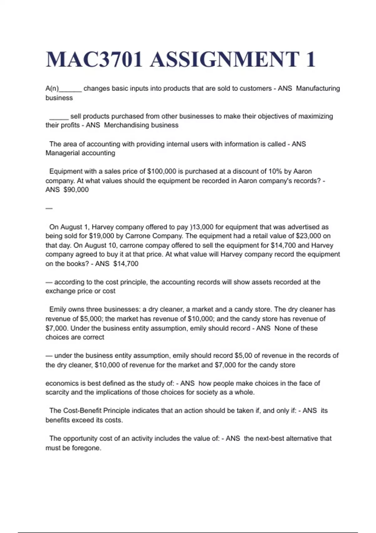 MAC3701 ASSIGNMENT 1 A(n)______ changes basic inputs into products that are sold to customers - ANS Manufacturing business _____ sell products purchased from other businesses to make their objectives of maximizing their profits - ANS Merchandising business The area of accounting with providing internal users with information is called - ANS Managerial accounting Equipment with a sales price of $100,000 is purchased at a discount of 10% by Aaron company. At what values should the equipment be recorded in Aaron company's records? - ANS $90,000 — On August 1, Harvey company offered to pay )13,000 for equipment that was advertised as being sold for $19,000 by Carrone Company. The equipment had a retail value of $23,000 on that day. On August 10, carrone compay offered to sell the equipment for $14,700 and Harvey company agreed to buy it at that price. At what value will Harvey company record the equipment on the books? - ANS $14,700 — according to the cost principle, the accounting records will show assets recorded at the exchange price or cost Emily owns three businesses: a dry cleaner, a market and a candy store. The dry cleaner has revenue of $5,000; the market has revenue of $10,000; and the candy store has revenue of $7,000. Under the business entity assumption, emily should record - ANS None of these choices are correct — under the business entity assumption, emily should record $5,00 of revenue in the records of the dry cleaner, $10,000 of revenue for the market and $7,000 for the candy store economics is best defined as the study of: - ANS how people make choices in the face of scarcity and the implications of those choices for society as a whole. The Cost-Benefit Principle indicates that an action should be taken if, and only if: - ANS its benefits exceed its costs. The opportunity cost of an activity includes the value of: - ANS the next-best alternative that must be foregone. The economic surplus of an action is - ANS the difference between the benefit and the cost of taking an action. The marginal benefit of an activity is the: - ANS extra benefit associated with an extra unit of the activity.