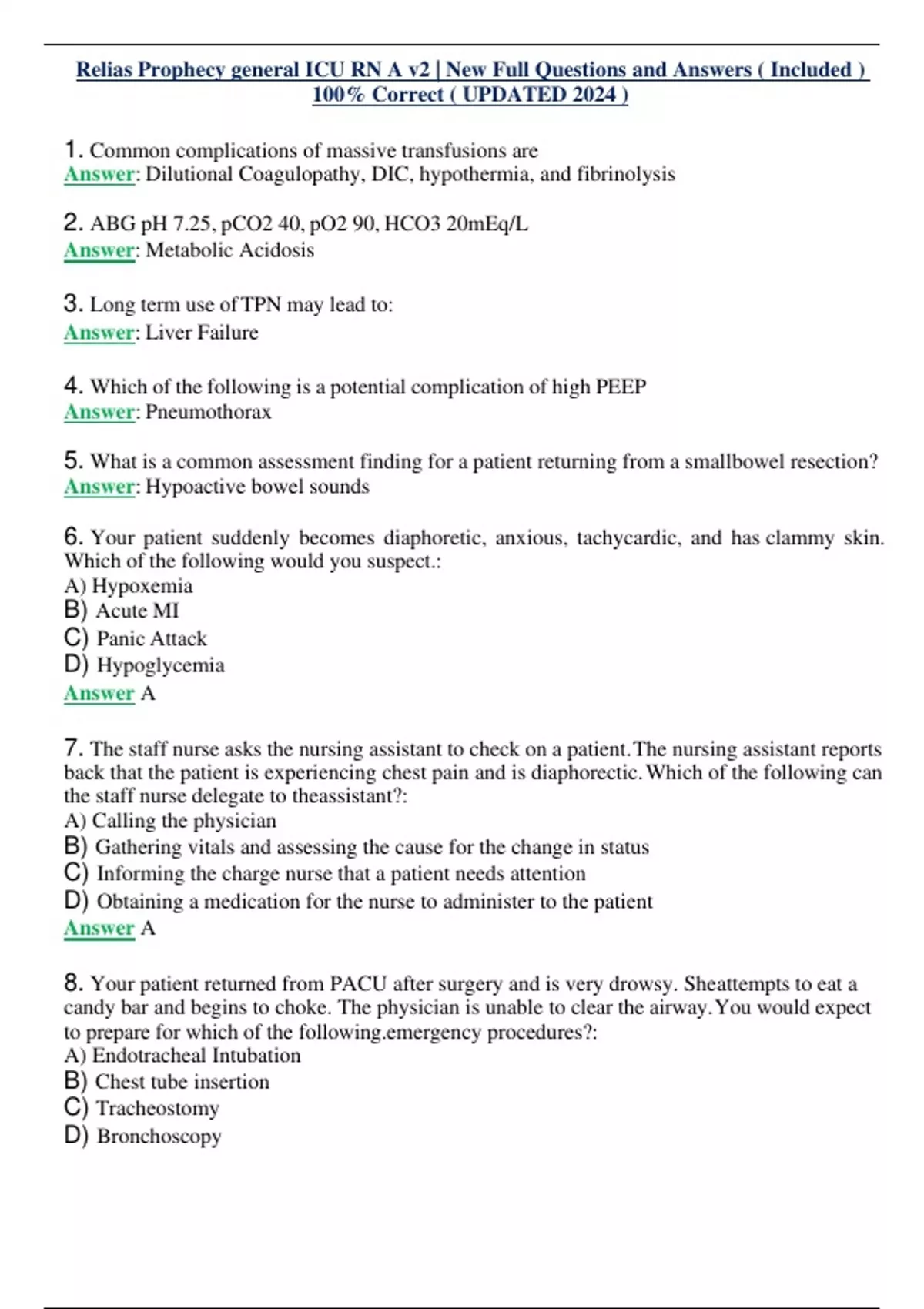 1. Common complications of massive transfusions are Answer: Dilutional Coagulopathy, DIC, hypothermia, and fibrinolysis 2. ABG pH 7.25, pCO2 40, pO2 90, HCO3 20mEq/L Answer: Metabolic Acidosis 3. Long term use ofTPN may lead to: Answer: Liver Failure 4. Which of the following is a potential complication of high PEEP Answer: Pneumothorax 5. What is a common assessment finding for a patient returning from a smallbowel resection? Answer: Hypoactive bowel sounds 6. Your patient suddenly becomes diaphoretic, anxious, tachycardic, and has clammy skin. Which of the following would you suspect.: A) Hypoxemia B) Acute MI C) Panic Attack D) Hypoglycemia Answer A 7. The staff nurse asks the nursing assistant to check on a patient.The nursing assistant reports back that the patient is experiencing chest pain and is diaphorectic.Which of the following can the staff nurse delegate to theassistant?: A) Calling the physician B) Gathering vitals and assessing the cause for the change in status C) Informing the charge nurse that a patient needs attention D) Obtaining a medication for the nurse to administer to the patient Answer A 8. Your patient returned from PACU after surgery and is very drowsy. Sheattempts to eat a candy bar and begins to choke. The physician is unable to clear the airway.You would expect to prepare for which of the ency procedures?: A) Endotracheal Intubation B) Chest tube insertion C) Tracheostomy D) Bronchoscopy Answer A