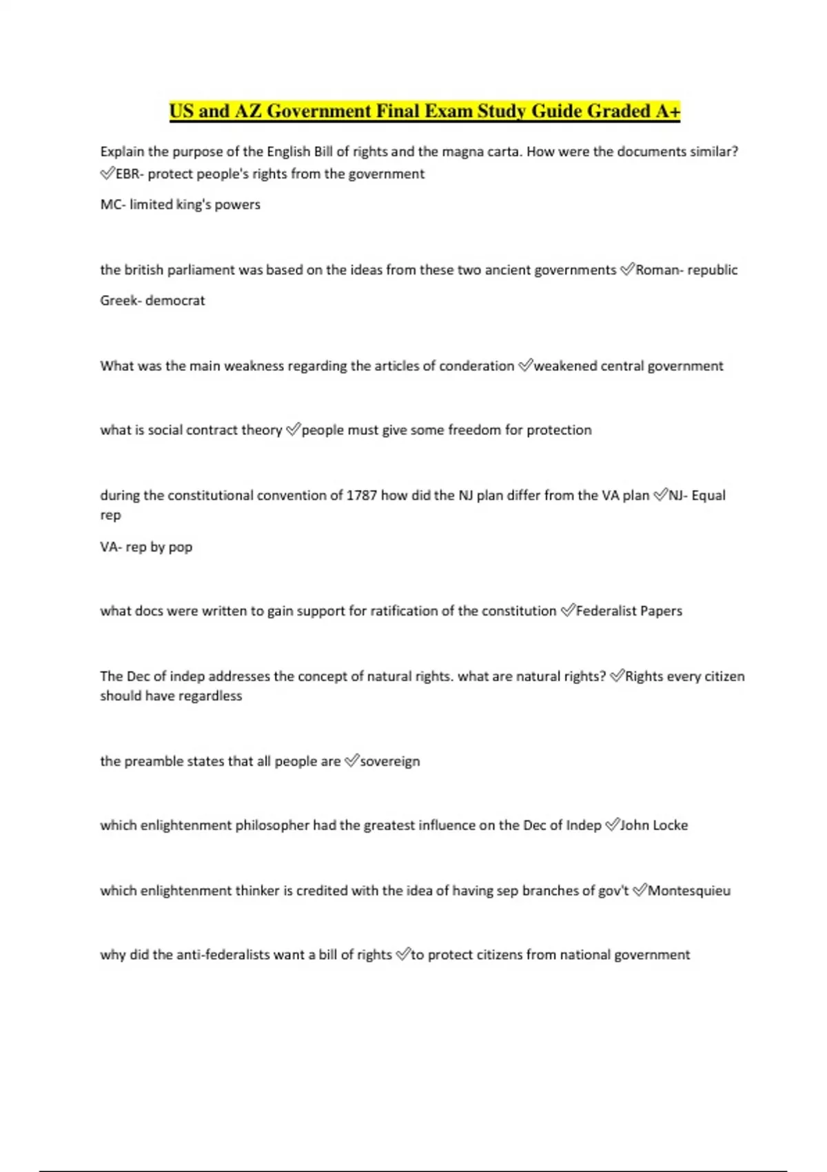 US and AZ Government Final Exam Study Guide Graded A+ Explain the purpose of the English Bill of rights and the magna carta. How were the documents similar? EBR- protect people's rights from the government MC- limited king's powers the british parliament was based on the ideas from these two ancient governments Roman- republic Greek- democrat What was the main weakness regarding the articles of conderation weakened central government what is social contract theory people must give some freedom for protection during the constitutional convention of 1787 how did the NJ plan differ from the VA plan NJ- Equal rep VA- rep by pop what docs were written to gain support for ratification of the constitution Federalist Papers The Dec of indep addresses the concept of natural rights. what are natural rights? Rights every citizen should have regardless the preamble states that all people are sovereign which enlightenment philosopher had the greatest influence on the Dec of Indep John Locke which enlightenment thinker is credited with the idea of having sep branches of gov't Montesquieu why did the anti-federalists want a bill of rights to protect citizens from national government what 3 political ideas about govt did the US borrow from England Limited, order, representative Totalitarian Govt All govt controlled Republican indirect democracy; electing representatives Direct Democracy People directly decide without leaders; council manager, town rep, commission, mayor council Checks and balances system that allows branches to check on ea other federalism separation of national and state power judicial review power of court to determine constitutionality of govt action purpose of us state dept handle foreign affairs what is the role of the Seniority Majority Leader Sets state agenda- most powerful in Senate List and explain roles of President S- state C- commander A- administrator L- legislative E- executive d- diplomat Common topic in Plessy VS Ferguson and Brown V Board Segragation Dual court system two system court of state and natl level Cabinet is in which branch executive which power of congress is the subject of gibbons V ogden interstate commerce How is a member of congress appointed a committee chair person seniority majority how is the president elected 1 Nomination 2 Popular vote 3 Electoral college why was marbury v madison a landmark case created judicial review and gave power to judicial branch where in the constitution can the expressed powers of each branch of govt be found Article 1- Legislative Article 2- Executive Article 3- Judicial explain the importance of mcculloch v maryland established necessary and proper clause; supremacy clause; implied powers in which house of congress do bill pertaining to revenue have to originate? House of represenatives what is the purpose of a joint committee in congress agree on bills explain the supreme court's appellate power authority of court to review discussions of lower courts explain how the electoral college works. why this is sometimes criticized? Need 270 out of 538 to win if not vote belongs to House of Rep; Questioned if it works what is the role of the House of Rep during a presidential impeachment? Senate? HofR- Brings charges Sen- tries impeachment what branch of the US govt largely determines domestic policy executive why does the us constitution require a census every ten years? Determine population and reapportion members of congress how is the presidential candidate chosen for each party electoral college what are some of the regulatory functions of the us govt protect you as a consumer: FDIC, FCC, FDA...etc what is the purpose of the "necessary and proper clause" found in article 1 of the constitution?? elastic clause- stretch and expand powers of the govt what is an expost facto law no retro active punishments explain the amendment process Proposal then ratification. Need 2/3 from House of congress and then 3/4 from house of legislature Amendments 22, 25, 26 22- Term years 25- Presidential Succession 26- Voting age is 18 shield law protect reporters from revealing sources 5 guarantees in first amend. What is the "right to petition the govt to redress grievances" Press, speech, assembly, petition, religion; Right to contact govt officials with concerns Gideon V Wainwright, Mapp V Ohio, Miranda V Arizona right to counsel, exclusionary rule, miranda rights purpose of 5th and 6th amendment Voting- extension of suffrage when can the police conduct without a search warrant? What does the 4th Amendment say about it? probable cause; consent; emergency; hot pursuit; plain view--- protection from unreasonable search and seizure purpose of 13th, 14th, 15th amendments 13- abolish slavery 14- citizenship 15- right to vote Separation of church and state. Which amendment? Government is not allowed to be involved with