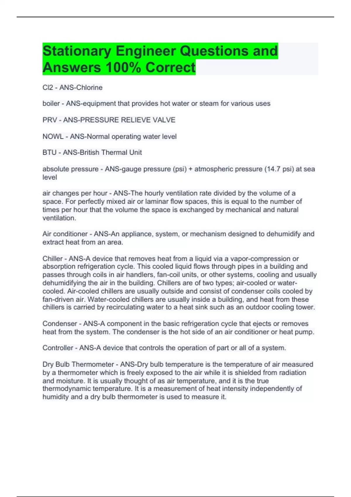 Stationary Engineer Questions and Answers 100% Correct