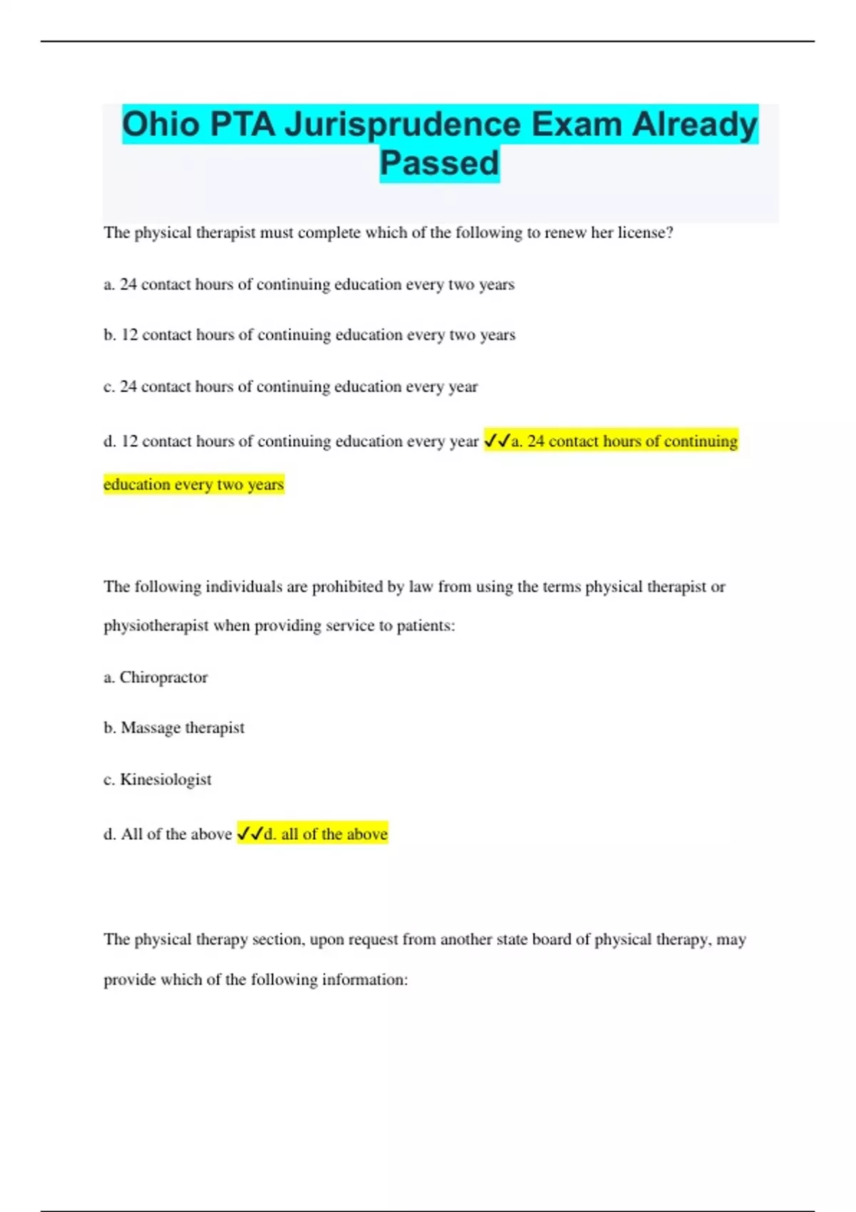 Ohio DMV Practice Questions and Answers 100% Pass When you are approaching the rear of a vehicle with an orange triangle, you must; ? reduce your speed and pass with care. Passing on the left is not permitted within: 100 feet of a bridge, viaduct or tunnel. On one-way streets, the driver may park a vehicle parallel to and not more than__________ from the right or left curb. 12 inches What is a statement that is NOT true when driving in fog? Use your high-beam headlights. On one-way roads, yellow lines are used as: Left-edge lines. When you see the letters 'RR' painted on the pavement, you are approaching: A rail-road crossing. The maximum speed limit in all alleys within a municipal corporation is: 15 mph In Ohio, you are legally __________, after stopping at a red traffic signal when the traffic is clear. allowed to turn right. You must use headlights when natural light conditions do not make it possible to clearly see objects __________(feet) ahead. 1,000 feet ahead. When you are closely following another vehicle at night, you must use: Low-beam lights. If a car approaches you with bright headlights, you must __________, to prevent being temporarily blinded. Look toward the right edge of the road. The allowed speed limit in school zones when children are going to or leaving school is: 20 mph You must maintain a safe stopping distance between you and the vehicle ahead by following: Three second rule. If you miss your exit on an interstate highway, you must: Take the next exit. As per Ohio's child restraint law, children who are under the age of__________ and weigh less than 40 pounds must be properly restrained in an approved child safety seat. Four A flashing yellow signal at an intersection means: All traffic shall slow down in speed while approaching intersection with caution. In Ohio, it is unlawful for a driver 21 or above, to operate a vehicle with a blood-alcohol concentration (BAC) of: 0.8 When you intend to turn, you must give the turn signal at least __________ before the actual turn. 100 feet When your vehicle starts to skid in winter due to icy