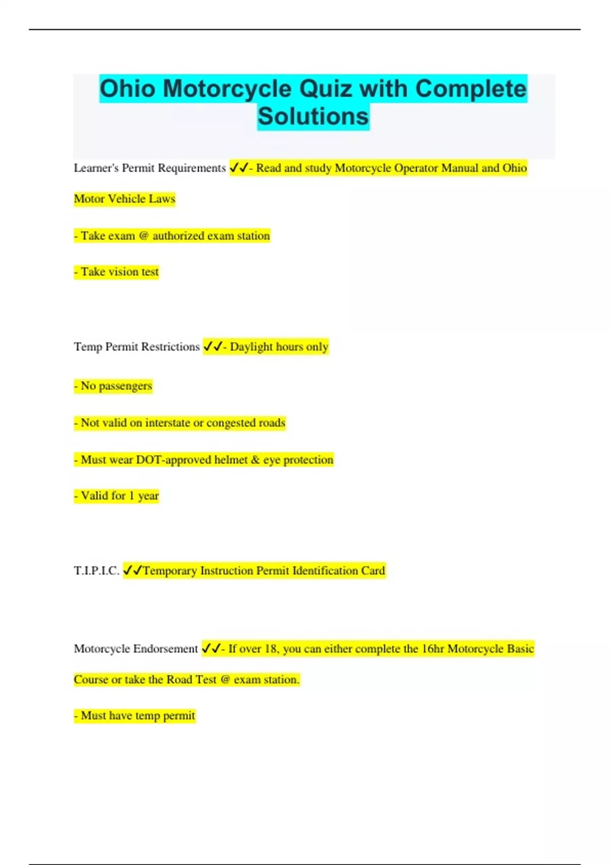 Ohio Motorcycle Quiz with Complete Solutions Learner's Permit Requirements - Read and study Motorcycle Operator Manual and Ohio Motor Vehicle Laws - Take exam @ authorized exam station - Take vision test Temp Permit Restrictions - Daylight hours only - No passengers - Not valid on interstate or congested roads - Must wear DOT-approved helmet & eye protection - Valid for 1 year T.I.P.I.C. Temporary Instruction Permit Identification Card Motorcycle Endorsement - If over 18, you can either complete the 16hr Motorcycle Basic Course or take the Road Test @ exam station. - Must have temp permit - Must have street legal motorcycle or scooter -Must have eyewear & DOT-approved helmet Motorcycle Endorsement Restrictions - Must wear helmet for first year. Motorcycle basic course - Must have DOT-approved helmet - Eyewear protection - Must have over the ankle footwear - 16hours total - Must have proof of insurance - Once complete, have 60days to obtain Endorsement Prepare to Ride - Wear correct gear - Be familiar with scooter/bike - Check equipment - Be responsible Right Gear - DOT-approved helmet - Face/eye protection - Protective clothing Accidents - 1 in 5 bike crashes are head/neck injuries - Most crashes happen within 5 or less miles & riding under 30MPH Helmet Types - 3quarters - full face Helmet Restrictions - Must be DOT and state approved - Snell Memorial Foundation approval - Fit snugly - No defects (cracks, missing padding, frayed straps) Eye Protection - Use plastic shatter-resistant faceshield or googles - Free of scratches - Resistant to flying objects - Provide clear view - Permit air to pass thru for anti-fogging - Securely fastened - Enough room for eyeglasses if necessary - Tinted protection not permitted @ night Clothing Requirements - Legs and arms need to be completely covered - Fitted clothing - Leather or weather resistant - Shoes be over the ankle, hard-soled, slip resistant, weather-resistant - Gloves with grip Bike Checklist - Check bike before every ride - Avoid modifications - Keep in safe riding condition Right Motorcycle for You - Be able to put feet on ground when seated Street-legal Requirements - Must have headlight, taillights & brake light - Front and rear brakes - Turn signals - Horn - 2 Mirrors