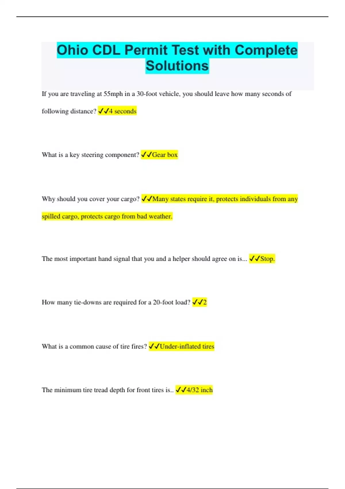 Ohio CDL Permit Test with Complete Solutions If you are traveling at 55mph in a 30-foot vehicle, you should leave how many seconds of following distance? 4 seconds What is a key steering component? Gear box Why should you cover your cargo? Many states require it, protects individuals from any spilled cargo, protects cargo from bad weather. The most important hand signal that you and a helper should agree on is... Stop. How many tie-downs are required for a 20-foot load? 2 What is a common cause of tire fires? Under-inflated tires The minimum tire tread depth for front tires is.. 4/32 inch How far ahead should you look while driving? 12 to 15 seconds You don't want to be a distracted driver, so you... Avoid using your cell phone until you reach your destination To maintain alertness on your trips, you should.. Avoid medications that cause drowsiness, schedule trips for the daytime hours, get 8-9 hours of sleep beforehand. To transport cargo safely, what are you not responsible for? Ensuring freshness of of sealed cargo. Your emergency kit does not need to include a.. A spare jacket While driving at night, which lights should you use as often as you can? High beams An antilock braking system (ABS) will.. Keep your wheels from locking when you brake hard What is something you should not do if you experience a tire failure? Brake hard and immediately Letting the air out of hot tires.. Is a bad idea because when the tires cool off, the pressure will be too low. What CMVs are most likely to get stuck at a raised railroad crossing? Lowboy, moving van, car carrier How long does it take a typical tractor-trailer