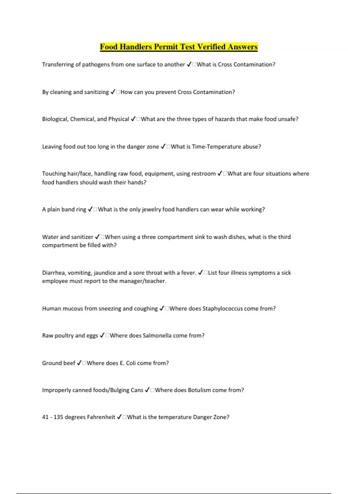 Food Handlers Permit Test Verified Answers Transferring of pathogens from one surface to another ️What is Cross Contamination? By cleaning and sanitizing ️How can you prevent Cross Contamination? Biological, Chemical, and Physical ️What are the three types of hazards that make food unsafe? Leaving food out too long in the danger zone ️What is Time-Temperature abuse? Touching hair/face, handling raw food, equipment, using restroom ️What are four situations where food handlers should wash their hands? A plain band ring ️What is the only jewelry food handlers can wear while working? Water and sanitizer ️When using a three compartment sink to wash dishes, what is the third compartment be filled with? Diarrhea, vomiting, jaundice and a sore throat with a fever. ️List four illness symptoms a sick employee must report to the manager/teacher. Human mucous from sneezing and coughing ️Where does Staphylococcus come from? Raw poultry and eggs ️Where does Salmonella come from? Ground beef ️Where does E. Coli come from? Improperly canned foods/Bulging Cans ️Where does Botulism come from? 41 - 135 degrees Fahrenheit ️What is the temperature Danger Zone? 155 degrees ️What temperature should ground meats reach? 165 degrees ️What temperature should poultry and reheated foods reach? 145 degrees ️What temperature should seafood, beef, veal, lamb and pork reach? Internally, thickest part ️Where should the temperature of foods always be checked? List the four ways to safely thaw frozen foods? ️1) Microwave 2) In sink 3) As part of the cooking process 4) In refrigerator for 2 - 3 days When one food allergen comes in contact with another food. ️What is cross - contact? Milk, soy, eggs, fish, shellfish, tree nuts, peanuts, and wheat ️List the big eight food allergens. Microbes that cause illness (GERMS) ️What are pathogens? 41 degrees or less ️What temperature should the refrigerator be? Temperature Control Safety ️What does TCS stand for? Four hours ️How long can foods be left out for before being thrown out? Dairy, Meat/Fish, Eggs, Shellfish, Cooked starches, and fresh fruit/veggies. ️What six foods are most at risk for time and temperature abuse (TCS)? Wet, apply soap, rinse, dry ️What is the proper order for handwashing? 10-15 seconds ️Time hands should be scrubbed with soap. After washing hands ️When should hand antiseptic be used? Handwashing only ️Handwashing sinks should be used for: After handling raw meats, when changing tasks, torn, dirty ️When do you change gloves?