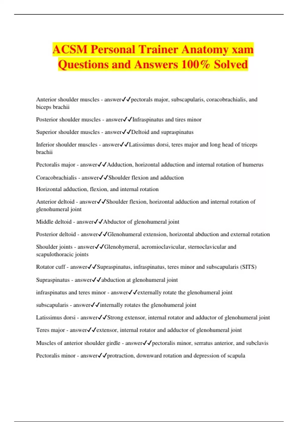 ACSM Personal Trainer Anatomy xam Questions and Answers 100% Solved Anterior shoulder muscles - answerpectorals major, subscapularis, coracobrachialis, and biceps brachii Posterior shoulder muscles - answerInfraspinatus and tires minor Superior shoulder muscles - answerDeltoid and supraspinatus Inferior shoulder muscles - answerLatissimus dorsi, teres major and long head of triceps brachii Pectoralis major - answerAdduction, horizontal adduction and internal rotation of humerus Coracobrachialis - answerShoulder flexion and adduction Horizontal adduction, flexion, and internal rotation Anterior deltoid - answerShoulder flexion, horizontal adduction and internal rotation of glenohumeral joint Middle deltoid - answerAbductor of glenohumeral joint Posterior deltoid - answerGlenohumeral extension, horizontal abduction and external rotation Shoulder joints - answerGlenohymeral, acromioclavicular, sternoclavicular and scapulothoracic joints Rotator cuff - answerSupraspinatus, infraspinatus, teres minor and subscapularis (SITS) Supraspinatus - answerabduction at glenohumeral joint infraspinatus and teres minor - answerexternally rotate the glenohumeral joint subscapularis - answerinternally rotates the glenohumeral joint Latissimus dorsi - answerStrong extensor, internal rotator and adductor of glenohumeral joint Teres major - answerextensor, internal rotator and adductor of glenohumeral joint Muscles of anterior shoulder girdle - answerpectoralis minor, serratus anterior, and subclavis Pectoralis minor - answerprotraction, downward rotation and depression of scapula Serratus anterior - answerprotracts scapula and active in reaching and pushing Subclavis - answerprotects and stabilizes sternoclavicular joint Posterior shoulder girdle muscles - answerLevator scapulae, rhomboids and trapezius Levator scapulae - answerelevate and downward rotate scapula and act on neck Rhomboids - answerscapular retraction, downward rotation, and slight elevation Upper trapezius - answerscapular elevation middle trapezius - answerscapular retraction lower trapezius - answerscapular depression Upper and lower trapezius - answerupward rotation of scapula Bones of shoulder region - answerhumerus, scapula and clavicle Coracohumeral ligament - answerbicipital groove of humerus and provides anteroinferior stability to glenohumeral joint Glenohumeral ligament - answerreinforce anterior capsule and provide stability Coracoacromial ligament - answerprotects muscles, tendons, nerves and blood supply acromioclavicular ligament - answerprovides stability to acromioclavicular joint coracoclavicular ligament - answerprevent superior dislocation of acromioclavicular joint sternoclavicular ligaments - answerhelps strengthen capsule of sternoclavicular joint costoclavicular ligament - answerconnects first rib and clavicle subacromial bursa - answerallows grinding between supraspinatus and deltoid tendons and acromion Elbow bones - answerhumerus, radius and ulna 3 elbow ligaments - answerulnar (medial) collateral, radial (lateral) collateral, and annular Elbow joints - answerhumeroulnar and humeroradial Anterior elbow muscles - answerbiceps brachii, brachialis and brachioradialis biceps brachii - answerstrong supinator and flexes elbow long head assists in shoulder flexion