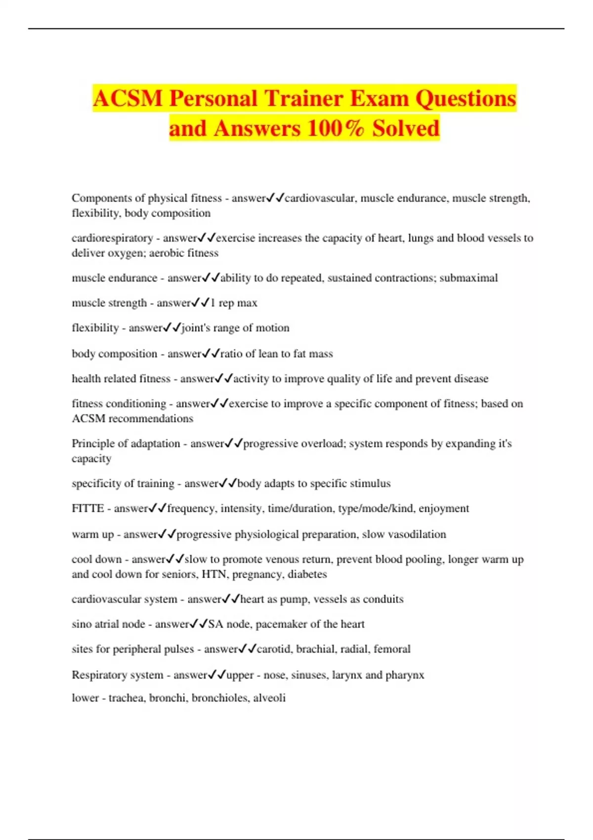 ACSM Personal Trainer Exam Questions and Answers 100% Solved Components of physical fitness - answercardiovascular, muscle endurance, muscle strength, flexibility, body composition cardiorespiratory - answerexercise increases the capacity of heart, lungs and blood vessels to deliver oxygen; aerobic fitness muscle endurance - answerability to do repeated, sustained contractions; submaximal muscle strength - answer1 rep max flexibility - answerjoint's range of motion body composition - answerratio of lean to fat mass health related fitness - answeractivity to improve quality of life and prevent disease fitness conditioning - answerexercise to improve a specific component of fitness; based on ACSM recommendations Principle of adaptation - answerprogressive overload; system responds by expanding it's capacity specificity of training - answerbody adapts to specific stimulus FITTE - answerfrequency, intensity, time/duration, type/mode/kind, enjoyment warm up - answerprogressive physiological preparation, slow vasodilation cool down - answerslow to promote venous return, prevent blood pooling, longer warm up and cool down for seniors, HTN, pregnancy, diabetes cardiovascular system - answerheart as pump, vessels as conduits sino atrial node - answerSA node, pacemaker of the heart sites for peripheral pulses - answercarotid, brachial, radial, femoral Respiratory system - answerupper - nose, sinuses, larynx and pharynx lower - trachea, bronchi, bronchioles, alveoli