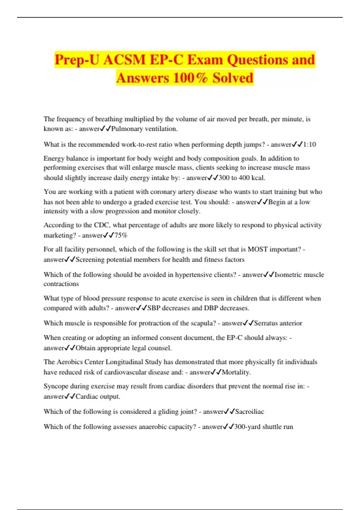 Prep-U ACSM EP-C Exam Questions and Answers 100% Solved The frequency of breathing multiplied by the volume of air moved per breath, per minute, is known as: - answerPulmonary ventilation. What is the recommended work-to-rest ratio when performing depth jumps? - answer1:10 Energy balance is important for body weight and body composition goals. In addition to performing exercises that will enlarge muscle mass, clients seeking to increase muscle mass should slightly increase daily energy intake by: - answer300 to 400 kcal. You are working with a patient with coronary artery disease who wants to start training but who has not been able to undergo a graded exercise test. You should: - answerBegin at a low intensity with a slow progression and monitor closely. According to the CDC, what percentage of adults are more likely to respond to physical activity marketing? - answer75% For all facility personnel, which of the following is the skill set that is MOST important? - answerScreening potential members for health and fitness factors Which of the following should be avoided in hypertensive clients? - answerIsometric muscle contractions What type of blood pressure response to acute exercise is seen in children that is different when compared with adults? - answerSBP decreases and DBP decreases. Which muscle is responsible for protraction of the scapula? - answerSerratus anterior When creating or adopting an informed consent document, the EP-C should always: - answerObtain appropriate legal counsel. The Aerobics Center Longitudinal Study has demonstrated that more physically fit individuals have reduced risk of cardiovascular disease and: - answerMortality. Syncope during exercise may result from cardiac disorders that prevent the normal rise in: - answerCardiac output. Which of the following is considered a gliding joint? - answerSacroiliac Which of the following assesses anaerobic capacity? - answer300-yard shuttle run At what age are children physically and mentally ready for resistance training exercise? - answer7 to 8 The exercise impact of the use of digitalis by clients with congestive heart failure is: - answerIncreased exercise capacity. The client screening process can be broken down into three phases comprising risk classification, health history evaluation and related assessments, and: - answerMedical clearance or referral. During the initial adjustment period to high altitude, what physiological change occurs during exercise? - answerStroke volume decreases Which of the following is a sign or symptom of pulmonary disease? - answerShortness of breath at mild exertion What is the maximum percentage of 1-RM that should be used to improve muscular power in older adults? - answer60% The posterior deltoid performs ________ of the shoulder joint at approximately ________. - answerExtension; 40-60 degrees Which of the following is a local stabilizer of the core musculature? - answerTransverse Abdominis Which of the following phases in plyometric training must be as short as possible to maximize training adaptations? - answerAmortization For all facility personnel, which of the following is the skill set that is MOST important? - answerScreening potential members for health and fitness factors A new, sedentary client has come to you and wants to lose weight. Which type of periodization is MOST appropriate to use? - answerFlexible nonlinear Which of the following is recommended for teaching clients proper for form for an exercise? - answerUsing a set-up phase prior to the exercise. As it relates to behavior modification, which of the following does NOT require a client to be committed to behavior change? - answerTranstheoretical model of change Which of the following is a positive risk factor? - answerRegular exposure to tobacco smoke Which of the following muscles functions as an agonist during shoulder flexion? - answerLong head of the biceps brachii The 2010 Dietary Guidelines for Americans recommend that individuals over age 50 consume foods fortified with which vitamin? - answerVitamin B12 Which of the following assessments BEST determines body fat distribution? - answerWaist- to-hip ratio The Theory of Planned Behavior suggests that successful behavior change is dependent on the client's subjective norms, perceived control, and: - answerAttitude. Which of the following weekly durations of moderate-intensity exercise meets the ACSM recommendation for weight loss or weight maintenance? - answer180 minutes You are working with a client who weighs 180 lbs with a body fat percentage of 20%. What will his approximate weight be when he reaches his goal of 15% body fat, assuming that his lean body mass remains constant? - answer169 lbs Ideal body weight calculation: 180 lbs x 0.20 = 36 lbs fat; 180 lbs - 36 = 144 lbs lean body mass. Ideal Body Weight = 144/(1 - 0.15) = 144/0.85 = 169 lbs Energy balance is important for body weight and body composition goals. In addition to performing exercises that will enlarge muscle mass, clients seeking to increase muscle mass should slightly increase daily energy intake by: - answer300 to 400 kcal. Which of the following is the MOST important consideration for an EP-C regarding supplements? - answerManufacturers don't usually carry any insurance coverage. During initial client contact, the EP-C should provide a service introduction packet that contains a health history evaluation, medical clearance form (if needed), informed consent, and: - answerThe Client-Certified Exercise Physiologist Agreement. Which type of exercise is indicated for someone with tendonitis who is still experiencing pain? - answerEccentric training During a straight-legged deadlift, which muscle(s) does MOST of the work as you extend the hip joint? - answerHamstrings The skill-related components of physical fitness include: - answerSpeed, agility, coordination, balance, power, and reaction time. During a back-loaded squat, what position should the head be in? - answerKeep the head forw