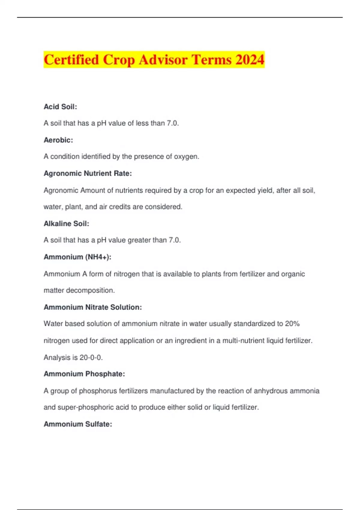 Certified Crop Advisor Terms 2024 Acid Soil: A soil that has a pH value of less than 7.0. Aerobic: A condition identified by the presence of oxygen. Agronomic Nutrient Rate: Agronomic Amount of nutrients required by a crop for an expected yield, after all soil, water, plant, and air credits are considered. Alkaline Soil: A soil that has a pH value greater than 7.0. Ammonium (NH4+): Ammonium A form of nitrogen that is available to plants from fertilizer and organic matter decomposition. Ammonium Nitrate Solution: Water based solution of ammonium nitrate in water usually standardized to 20% nitrogen used for direct application or an ingredient in a multi-nutrient liquid fertilizer. Analysis is 20-0-0. Ammonium Phosphate: A group of phosphorus fertilizers manufactured by the reaction of anhydrous ammonia and super-phosphoric acid to produce either solid or liquid fertilizer. Ammonium Sulfate: A fertilizer with an analysis of 21-0-0 and 24% sulfur. Anaerobic: A condition identified by the absence of oxygen Anhydrous Ammonia (NH3): Nitrogen fertilizer made by compressing air and natural gas under high temperature in the presence of a catalyst. Analysis is 82-0-0. Animal Unit: 1000 pounds of live animal weight, a term used to determine volumes of animal manure produced. Anion: An ion that has a negative electrical charge. Common anions include sulfate, and nitrate. Anion Exchange Capacity: The sum total of exchangeable anions that a soil can adsorb. Expressed as centimoles of charge per kilogram (cmolc/kg) of soil or milliequivalents per 100 g of soil (meq/100 g of soil). Application Rate: The weight or volume of a fertilizer, soil amendment, or pesticide applied per unit area. Available Nutrient: The form of a nutrient that the plant is able to use. Many nutrients are in forms the plant cannot u and must be converted to forms available to the plant to be useful. Banded Nutrients: Placing fertilizer nutrients in a band near the seed at planting. Also may include a separate surface or subsurface band application of either solid or liquid materials before or after planting. Base Saturation Percentage: The proportion of the soil's cation exchange capacity occupied by basic cations. Bioremediation: The use of biological agents to reclaim soil and/or water polluted by substances hazardous to human health or the environment. Biosolid: Any organic material, such as livestock manure, compost, sewage sludge or yard wastes applied to the soil to add nutrients or for soil improvement. Buildup and Maintenance: Nutrients applied in order to build up a target soil test level and then maintained by annual addition of the quantity of nutrients expected to be removed in the harvested portion of the crop. Calcite Lime: Limestone consisting of CaCO3 based material with low magnesium levels. Calcium Carbonate Equivalent (CCE): The liming potential of material as compared to CaCO3. Cation: An ion that has a positive electrical charge. Common soil cations are calcium, magnesium, hydrogen, sodium and potassium. Cation Exchange Capacity (CEC): The amount of exchangeable cations that a soil can adsorb at a specific pH, expressed as milliequivalents per 100 gram of soil (meq/100 g soil) or (cmol charge/kg). Cation Exchange Sites: Negatively charged sites on the surfaces of clays and organic matter. Chelated Molecule: A large water-soluble organic molecule that binds with a free metal ion to form a water- soluble complex. Chelation improves the solubility and plant availability of the metal ion. Comprehensive Nutrient Management Plan: A group of conservation practices and management activities unique to animal feeding operations, which ensures efficient crop production as well as natural resource protection. Critical Value: The point between sufficiency and deficiency levels of a nutrient. Crop Nutrient Requirement: The amount of nutrients needed to growa specified crop yield, expressed per unit area. Crop Removal Rate: The amount of nutrients that are removed from the field in the plant harvest, including grain, fruit forage and residues that are removed from the field. Crop Rotation: A planned sequence of crops growing in a regularly recurring succession to the same area. Crop Utilization Rate: