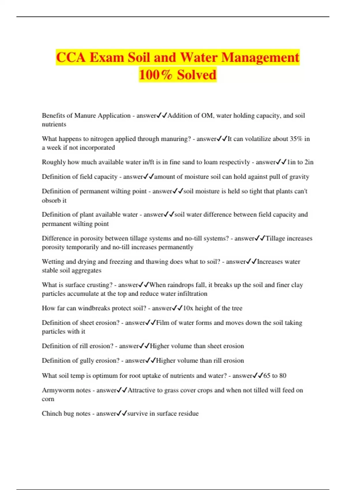 CCA Exam Soil and Water Management 100% Solved Benefits of Manure Application - answerAddition of OM, water holding capacity, and soil nutrients What happens to nitrogen applied through manuring? - answerIt can volatilize about 35% in a week if not incorporated Roughly how much available water in/ft is in fine sand to loam respectivly - answer1in to 2in Definition of field capacity - answeramount of moisture soil can hold against pull of gravity Definition of permanent wilting point - answersoil moisture is held so tight that plants can't obsorb it Definition of plant available water - answersoil water difference between field capacity and permanent wilting point Difference in porosity between tillage systems and no-till systems? - answerTillage increases porosity temporarily and no-till increases permanently Wetting and drying and freezing and thawing does what to soil? - answerIncreases water stable soil aggregates What is surface crusting? - answerWhen raindrops fall, it breaks up the soil and finer clay particles accumulate at the top and reduce water infiltration How far can windbreaks protect soil? - answer10x height of the tree Definition of sheet erosion? - answerFilm of water forms and moves down the soil taking particles with it Definition of rill erosion? - answerHigher volume than sheet erosion Definition of gully erosion? - answerHigher volume than rill erosion What soil temp is optimum for root uptake of nutrients and water? - answer65 to 80 Armyworm notes - answerAttractive to grass cover crops and when not tilled will feed on corn Chinch bug notes - answersurvive in surface residue