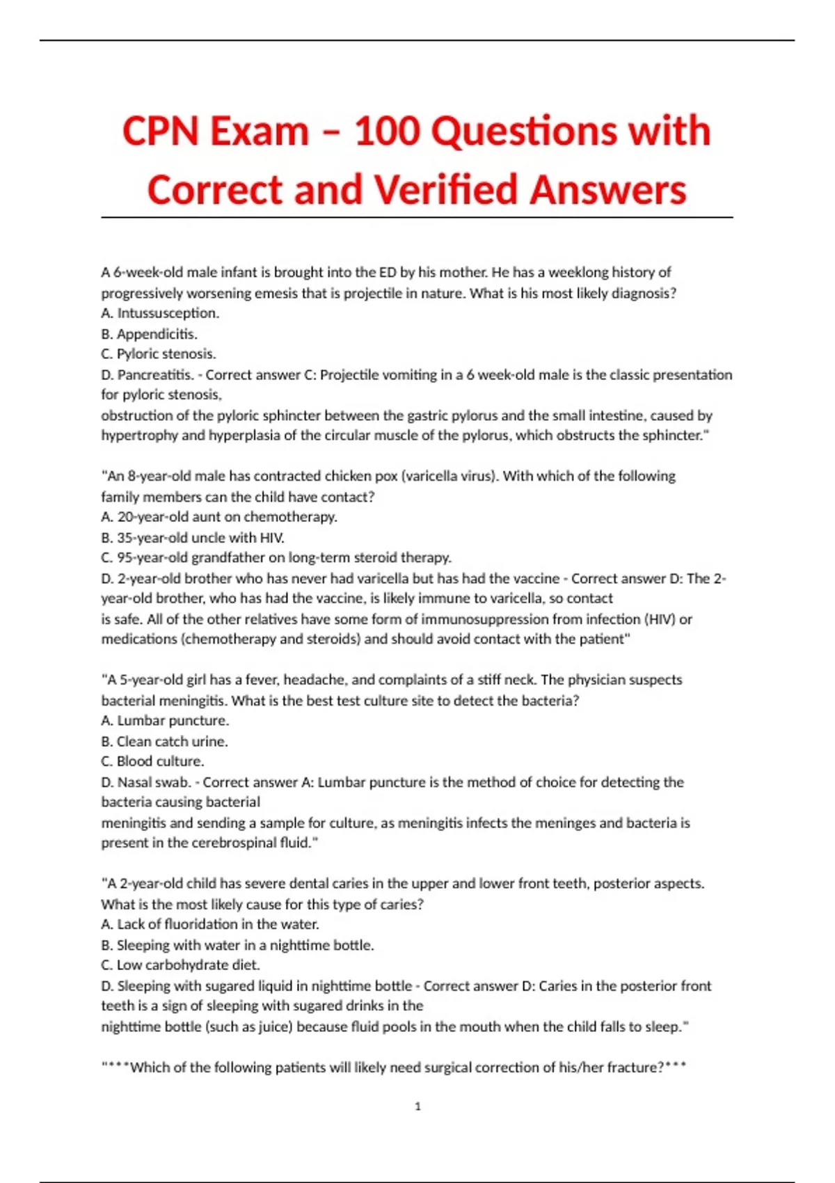 CPN Exam – 100 Questions with Correct and Verified Answers A 6-week-old male infant is brought into the ED by his mother. He has a weeklong history of progressively worsening emesis that is projectile in nature. What is his most likely diagnosis? A. Intussusception. B. Appendicitis. C. Pyloric stenosis. D. Pancreatitis. - Correct answer C: Projectile vomiting in a 6 week-old male is the classic presentation for pyloric stenosis, obstruction of the pyloric sphincter between the gastric pylorus and the small intestine, caused by hypertrophy and hyperplasia of the circular muscle of the pylorus, which obstructs the sphincter." "An 8-year-old male has contracted chicken pox (varicella virus). With which of the following family members can the child have contact? A. 20-year-old aunt on chemotherapy. B. 35-year-old uncle with HIV. C. 95-year-old grandfather on long-term steroid therapy. D. 2-year-old brother who has never had varicella but has had the vaccine - Correct answer D: The 2-year-old brother, who has had the vaccine, is likely immune to varicella, so contact is safe. All of the other relatives have some form of immunosuppression from infection (HIV) or medications (chemotherapy and steroids) and should avoid contact with the patient" "A 5-year-old girl has a fever, headache, and complaints of a stiff neck. The physician suspects bacterial meningitis. What is the best test culture site to detect the bacteria? A. Lumbar puncture. B. Clean catch urine. C. Blood culture. D. Nasal swab. - Correct answer A: Lumbar puncture is the method of choice for detecting the bacteria causing bacterial meningitis and sending a sample for culture, as meningitis infects the meninges and bacteria is present in the cerebrospinal fluid." "A 2-year-old child has severe dental caries in the upper and lower front teeth, posterior aspects. What is the most likely cause for this type of caries? A. Lack of fluoridation in the water. B. Sleeping with water in a nighttime bottle. C. Low carbohydrate diet. D. Sleeping with sugared liquid in nighttime bottle - Correct answer D: Caries in the posterior front teeth is a sign of sleeping with sugared drinks in the nighttime bottle (such as juice) because fluid pools in the mouth when the child falls to sleep." "***Which of the following patients will likely need surgical correction of his/her fracture?*** A. 10-year-old with humeral head fracture. B. 5-year-old with tuft fracture of the distal phalanx. C. 4-year-old with tuft fracture of the toe. D. 16-year-old with radial head fracture. - Correct answer A: Humeral head fractures usually need open reduction and internal fixation to maintain proper future functioning. Distal phalanx and toe fractures are treated with splints and fracture of the radial head with a sling." "An infant with a chronic respiratory condition should be offered all of the following vaccines EXCEPT: A. Hepatitis A. B. Hepatitis B. C. Hepatitis C. D. Influenza. - Correct answer C: A vaccine for Hepatitis C does not currently exist. Hepatitis A, hepatitis B and influenza vaccines are all recommended for the infant" "A 14-year-old boy with leukemia is receiving an IV infusion of packed red blood cells. The client reports that he is feeling anxious and short of breath even though his respiratory rate is 24. What should the nurse do in this situation? A. Give a dose of ibuprofen (Motrin). B. Give a dose of acetaminophen (Tylenol). C. Give a dose of diphenhydramine (Benadryl). D. Stop infusion and notify physician. - Correct answer D: Anxiety and the sensation of breathlessness are signs of possible anaphylactic shock, a reaction to the packed red blood cells, so the nurse should stop the infusion immediately and notify the physician." "As part of counseling for a 7-year-old child with mild persistent asthma, the nurse tells the client's family that the most reliable indicator of worsening asthma is: A. Coughing. B. Fever. C. Decreased peak flow. D. Fatigue. - Correct answer C: A decreased peak flow is the most reliable indicator that asthma may be worsening. It is therefore vital that the client's family know what the baseline is so that any deviation can be quickly addressed. Coughing and fever may trigger asthma, so peak flows should be monitored. Fatigue may result from poor oxygenation but alone it is not a reliable indicator of worsening asthma." "***A patient is experiencing dizziness, shortness of breath, lightheadedness, and nausea caused by encephalitis. Which of the following descriptions most accurately describes the patient's condition?*** A. metabolic acidosis B. respiratory alkalosis C. metabolic alkalosis D. respiratory acidosis - Correct answer B: Respiratory alkalosis results from hyperventilation, during which extra CO2 is excreted, causing a decrease in carbonic acid (H2CO3) concentration in the plasma. Symptoms include tachycardia, arrhythmias, lightheadedness, nausea, and vomiting." "10-year-old male with sickle cell disease comes into the ED complaining of pain in his legs due to a vaso-occlusive crisis. In addition to IV fluids, what is the other initial treatment for this client? A. Elevate legs. B. Ace wrap to legs. C. Nitroglycerine paste. D. Pain medication. - Correct answer D: In addition to IV fluids, the other primary initial treatment for sickle cell crisis resulting in vascular occlusion is pain medication because pain is often severe. Other treatments include oxygen, hydroxyurea (anti-sickling medication), blood transfusions if anemia is pronounced, and antibiotics if the crisis was triggered by an infection." "14-year-old male with renal failure is given an arteriovenous fistula (shunt) for future dialysis. How does the nurse assess the shunt post-operatively for patency? A. Assess for bruit and thrill. B. Monitor blood pressure on that arm. C. Ease of venipuncture at shunt site. D. Rate of flow during dialysis. - Correct answer A: The patency of an AV shunt is assured by assessing for bruit and thrill. Continuous w
