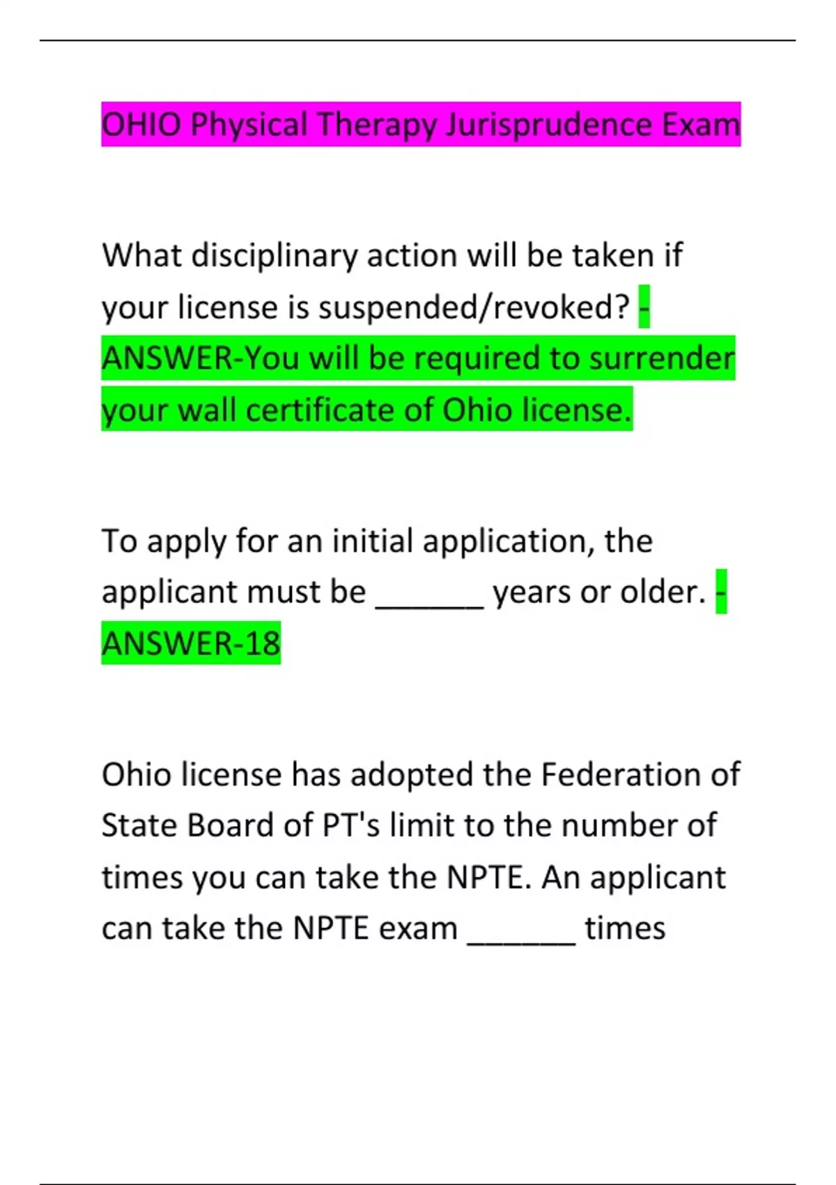 OHIO Physical Therapy Jurisprudence Exam