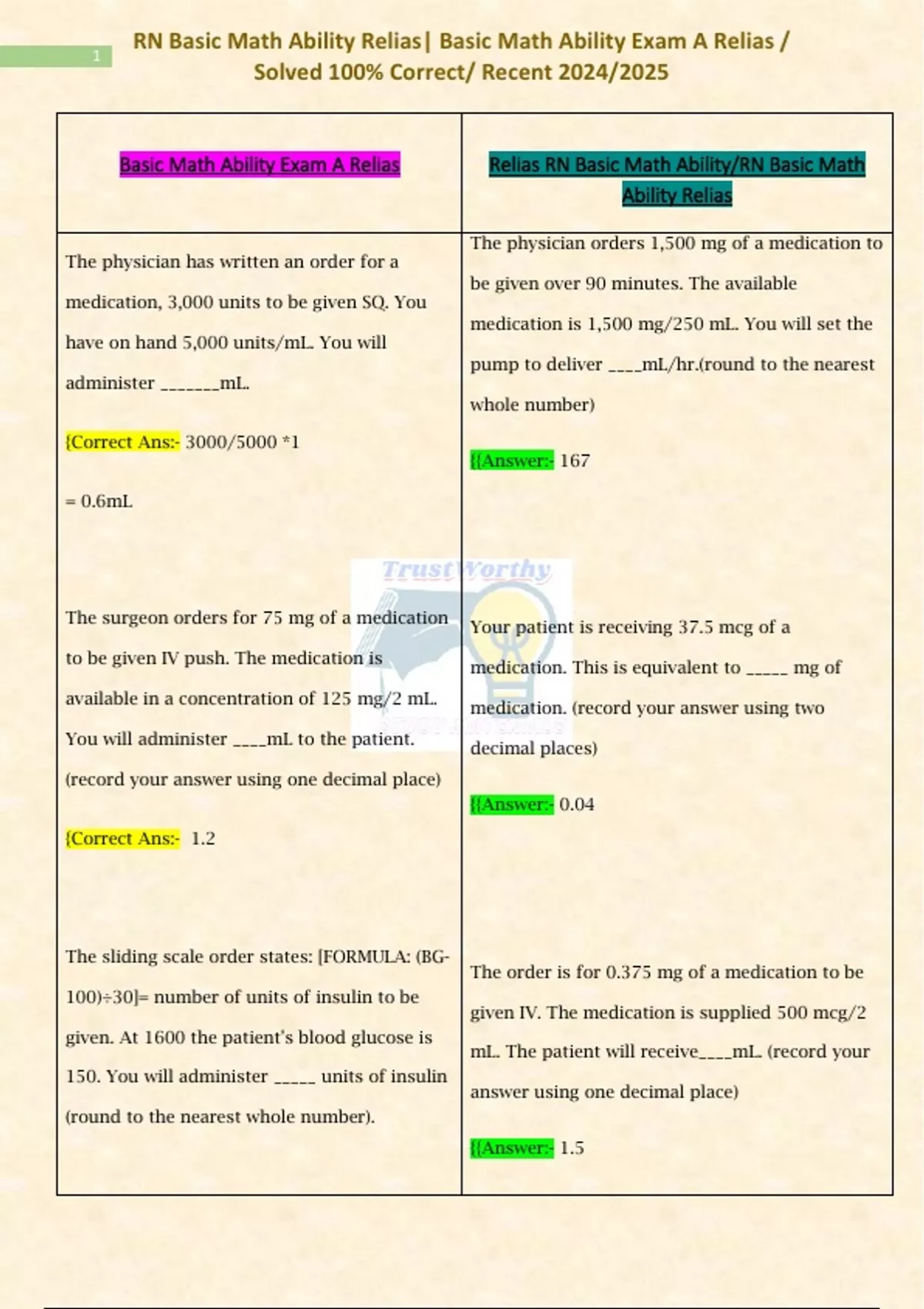 RN Basic Math Ability Relias| Basic Math Ability Exam A Relias / Solved 100% Correct/ Recent 2024/2025