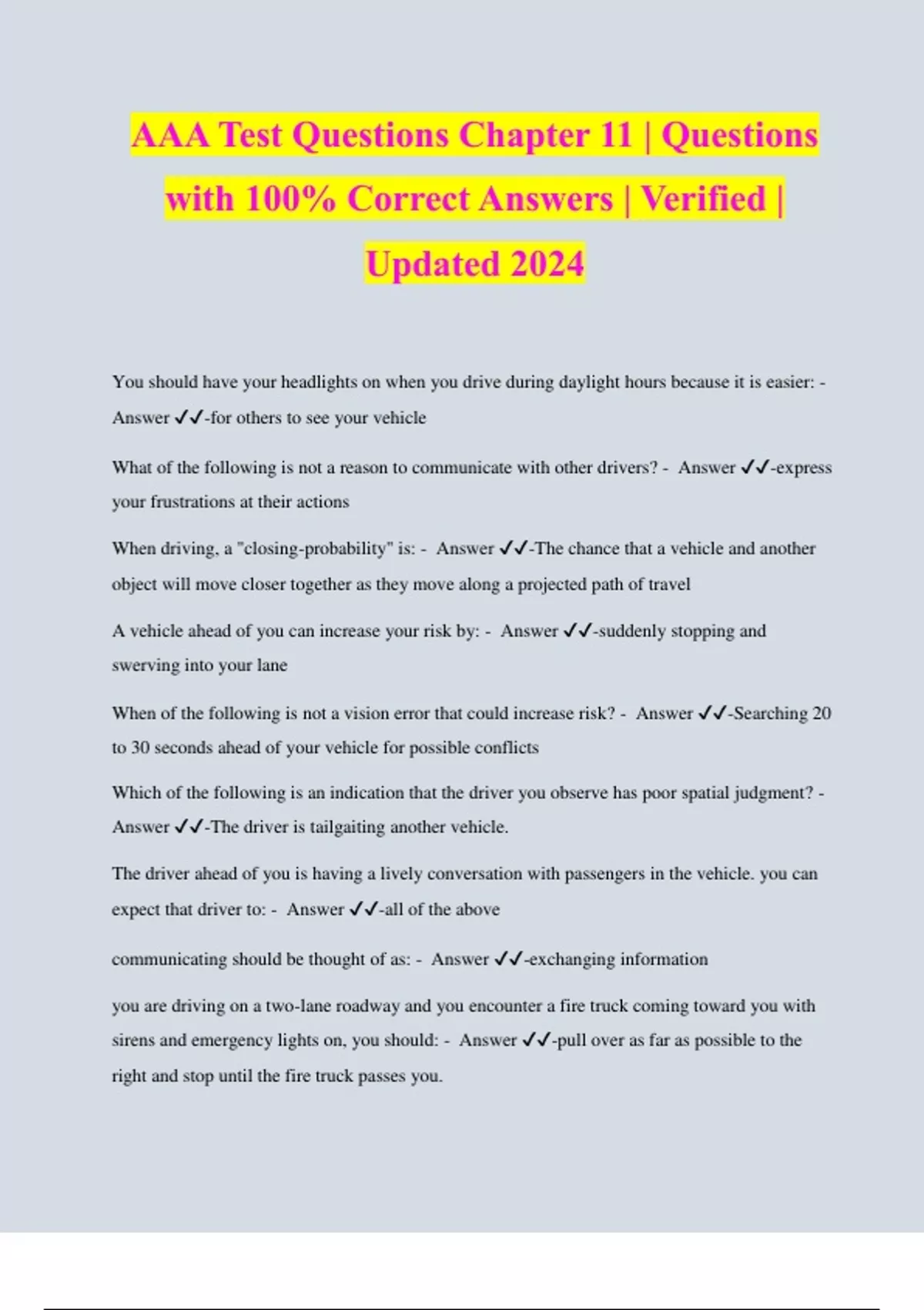 AAA Test Questions Chapter 11 | Questions with 100% Correct Answers | Verified | Updated 2024 You should have your headlights on when you drive during daylight hours because it is easier: - Answer ️️ -for others to see your vehicle What of the following is not a reason to communicate with other drivers? - Answer ️️ -express your frustrations at their actions When driving, a "closing-probability" is: - Answer ️️ -The chance that a vehicle and another object will move closer together as they move along a projected path of travel A vehicle ahead of you can increase your risk by: - Answer ️️ -suddenly stopping and swerving into your lane When of the following is not a vision error that could increase risk? - Answer ️️ -Searching 20 to 30 seconds ahead of your vehicle for possible conflicts Which of the following is an indication that the driver you observe has poor spatial judgment? - Answer ️️ -The driver is tailgaiting another vehicle.