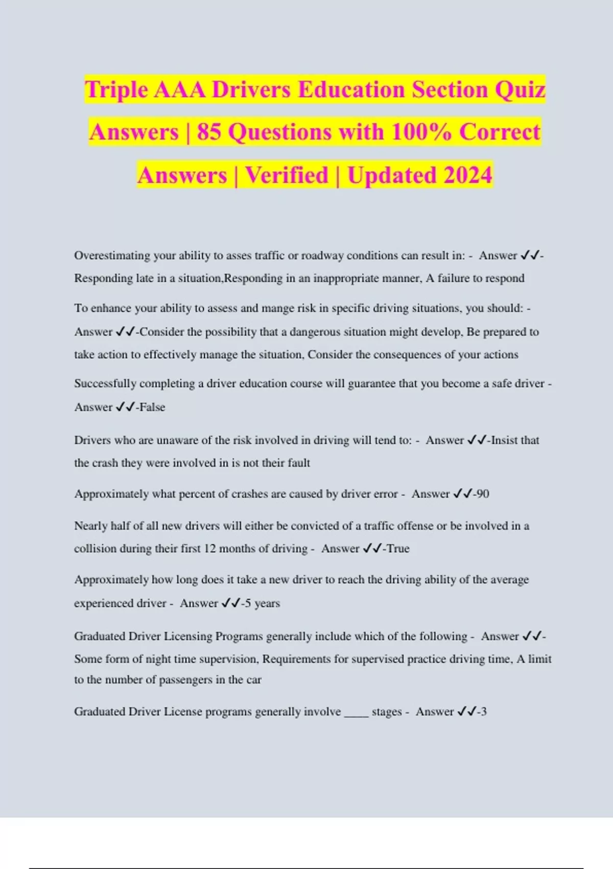 Triple AAA Drivers Education Section Quiz Answers | 85 Questions with 100% Correct Answers | Verified | Updated 2024 Overestimating your ability to asses traffic or roadway conditions can result in: - Answer ️️ - Responding late in a situation,Responding in an inappropriate manner, A failure to respond To enhance your ability to assess and mange risk in specific driving situations, you should: - Answer ️️ -Consider the possibility that a dangerous situation might develop, Be prepared to take action to effectively manage the situation, Consider the consequences of your actions Successfully completing a driver education course will guarantee that you become a safe driver - Answer ️️ -False Drivers who are unaware of the risk involved in driving will tend to: - Answer ️️ -Insist that the crash they were involved in is not their fault Approximately what percent of crashes are caused by driver error - Answer ️️ -90 Nearly half of all new drivers will either be convicted of a traffic offense or be involved in a collision during their first 12 months of driving - Answer ️️ -True Approximately how long does it take a new driver to reach the driving ability of the average experienced driver - Answer ️️ -5 years Graduated Driver Licensing Programs generally include which of the following - Answer ️️ - Some form of night time supervision, Requirements for supervised practice driving time, A limit to the number of passengers in the car Graduated Driver License programs generally involve ____ stages - Answer ️️ -3 Which of the following presents the greatest advantage of a Parent-Teen driving Agreement - Answer ️️ -The teen will be able to establish clear communication channels wit respect to vehicle use Parents should work as a team with a driving instructor to provide practice for the new driver - Answer ️️ -True