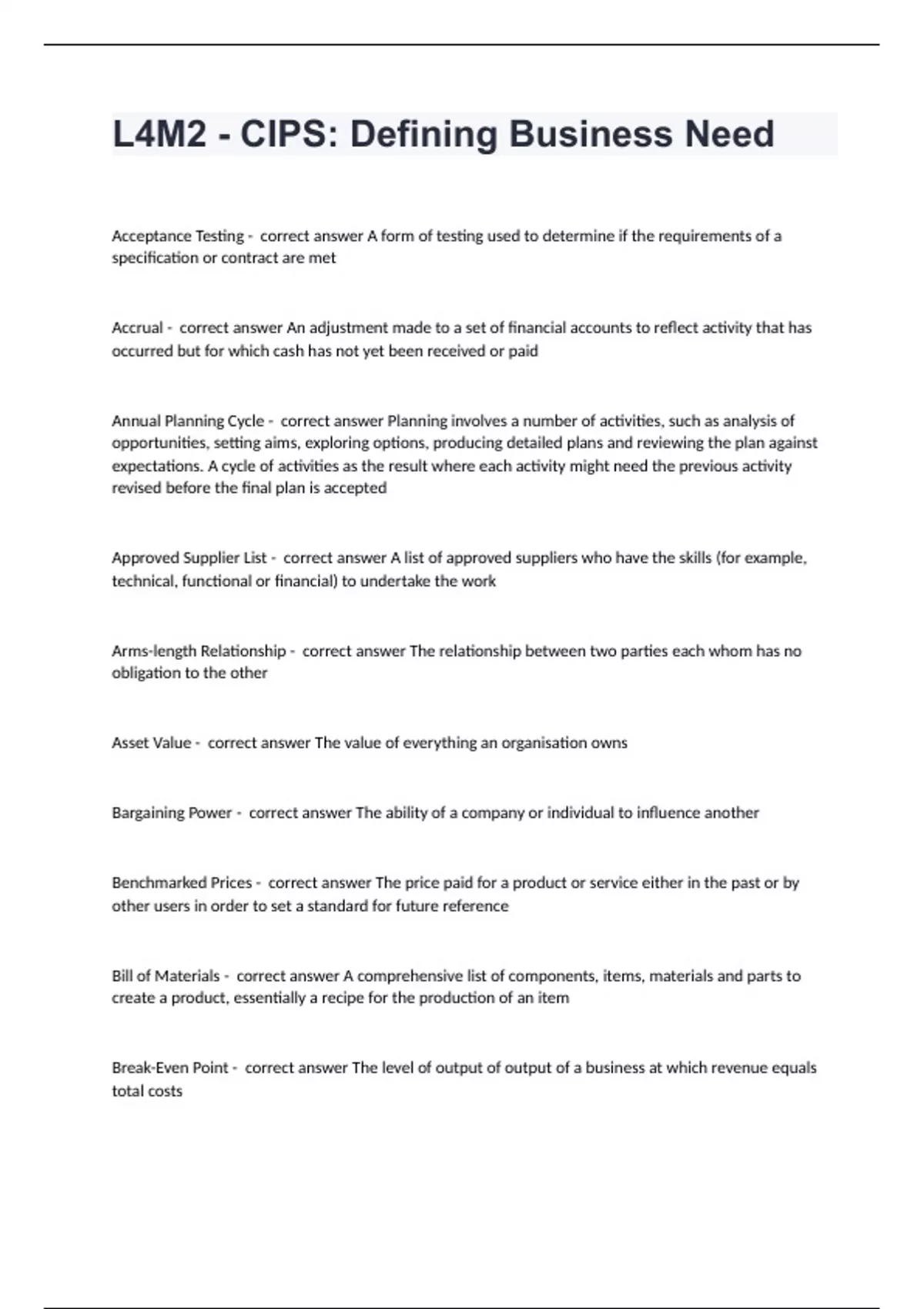 L4M2 - CIPS: Defining Business NeedAcceptance Testing - correct answer A form of testing used to determine if the requirements of a specification or contract are met Accrual - correct answer An adjustment made to a set of financial accounts to reflect activity that has occurred but for which cash has not yet been received or paid Annual Planning Cycle - correct answer Planning involves a number of activities, such as analysis of opportunities, setting aims, exploring options, producing detailed plans and reviewing the plan against expectations. A cycle of activities as the result where each activity might need the previous activity revised before the final plan is accepted Approved Supplier List - correct answer A list of approved suppliers who have the skills (for example, technical, functional or financial) to undertake the work Arms-length Relationship - correct answer The relationship between two parties each whom has no obligation to the other Asset Value - correct answer The value of everything an organisation owns Bargaining Power - correct answer The ability of a company or individual to influence another Benchmarked Prices - correct answer The price paid for a product or service either in the past or by other users in order to set a standard for future reference Bill of Materials - correct answer A comprehensive list of components, items, materials and parts to create a product, essentially a recipe for the production of an item Break-Even Point - correct answer The level of output of output of a business at which revenue equals total costs