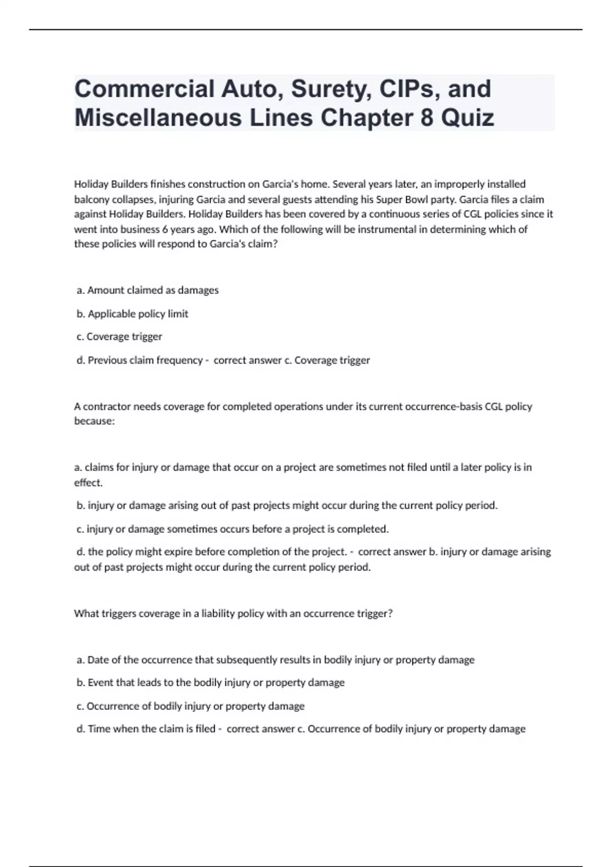 Commercial Auto, Surety, CIPs, and Miscellaneous Lines Chapter 8 QuizHoliday Builders finishes construction on Garcia's home. Several years later, an improperly installed balcony collapses, injuring Garcia and several guests attending his Super Bowl party. Garcia files a claim against Holiday Builders. Holiday Builders has been covered by a continuous series of CGL policies since it went into business 6 years ago. Which of the following will be instrumental in determining which of these policies will respond to Garcia's claim? a. Amount claimed as damages b. Applicable policy limit c. Coverage trigger d. Previous claim frequency - correct answer c. Coverage trigger A contractor needs coverage for completed operations under its current occurrence-basis CGL policy because: a. claims for injury or damage that occur on a project are sometimes not filed until a later policy is in effect. b. injury or damage arising out of past projects might occur during the current policy period. c. injury or damage sometimes occurs before a project is completed. d. the policy might expire before completion of the project. - correct answer b. injury or damage arising out of past projects might occur during the current policy period. What triggers coverage in a liability policy with an occurrence trigger? a. Date of the occurrence that subsequently results in bodily injury or property damage b. Event that leads to the bodily injury or property damage c. Occurrence of bodily injury or property damage d. Time when the claim is filed - correct answer c. Occurrence of bodily injury or property damage