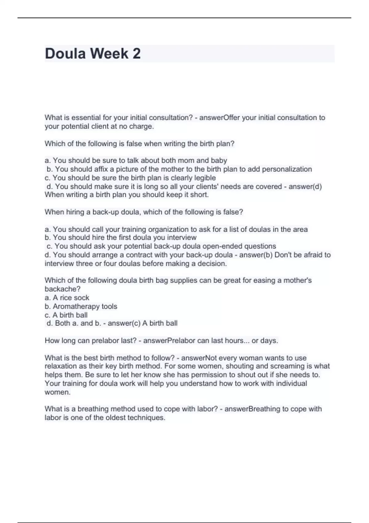 Doula Week 2 Questions and Answers 2024