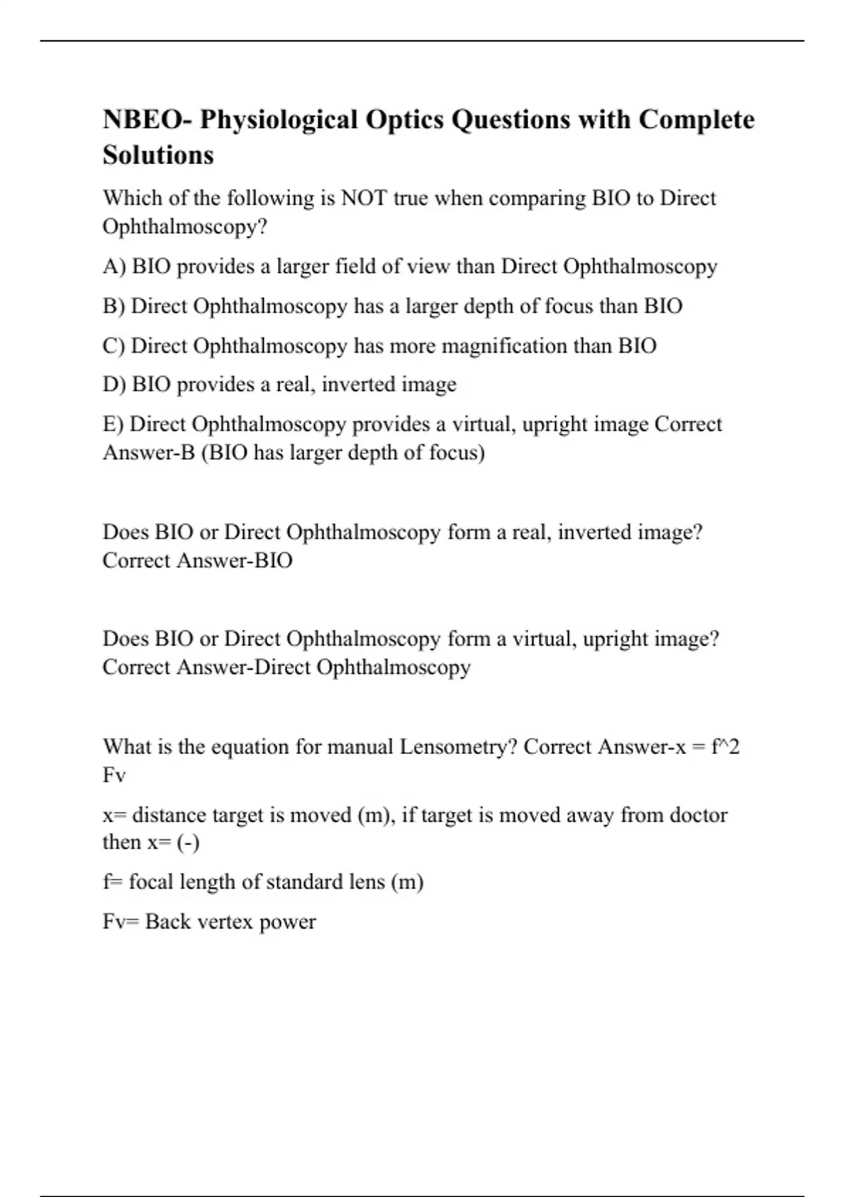 NBEO- Physiological Optics Questions with Complete Solutions